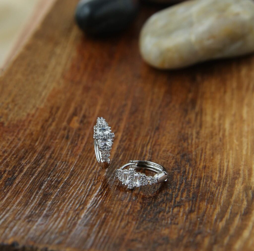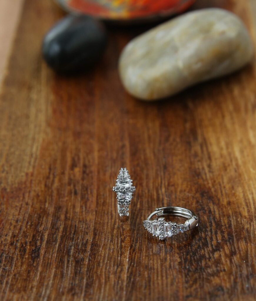 Discover the charm of these Radiant Silver Hoop Earrings, which have a magnificent triangular crystal pattern that brings a new edge to a timeless style. These earrings, made of high-quality silver, sparkle with each movement, making them a standout accessory for any event. The gems’ unusual geometric design exudes contemporary elegance, making them ideal for both wear and exceptional occasions. Lightweight and comfy, they provide a secure fit, allowing you to shine proudly wherever you go. Elevate your jewelry collection with these stunning earrings that seamlessly combine sophistication and style.