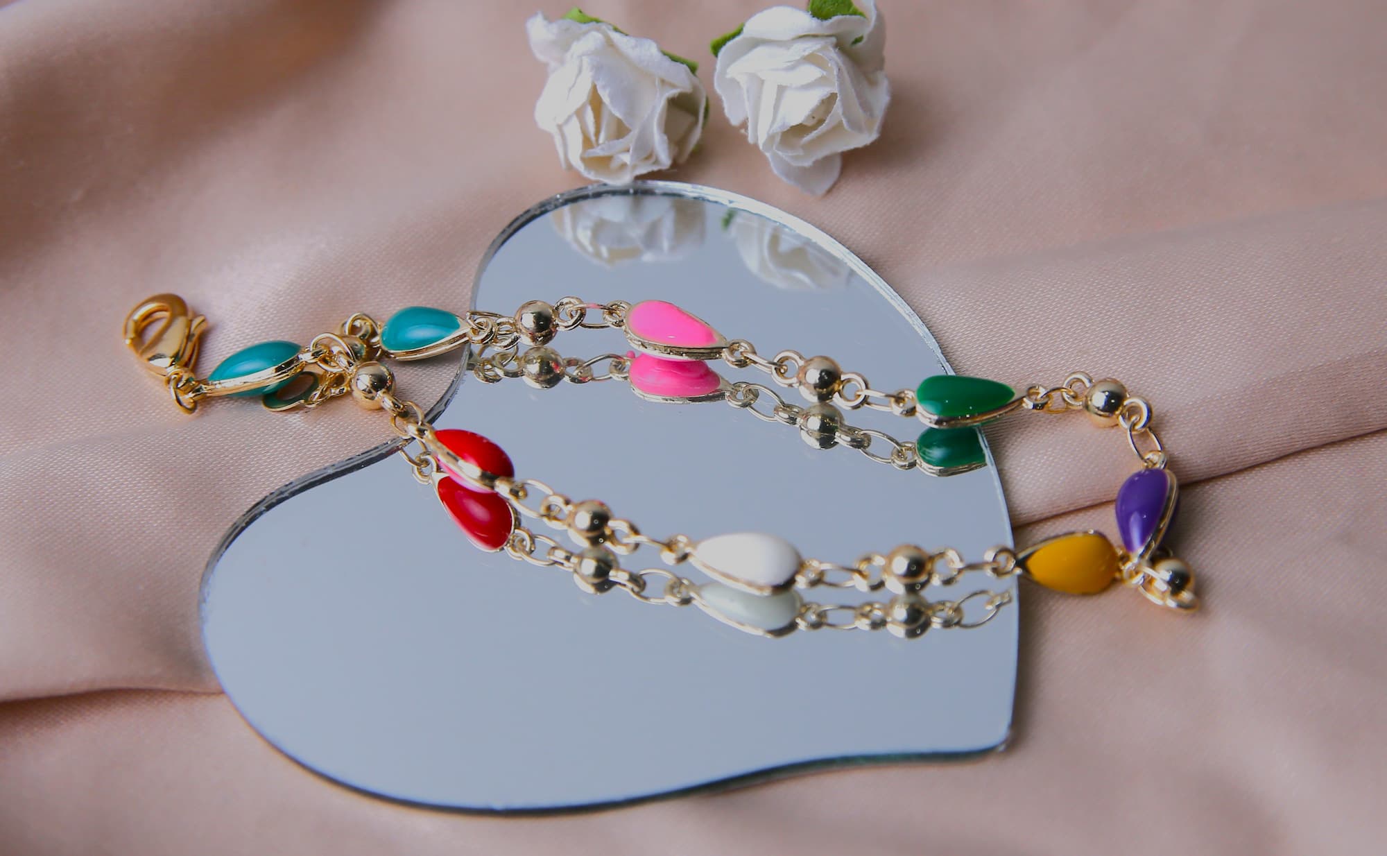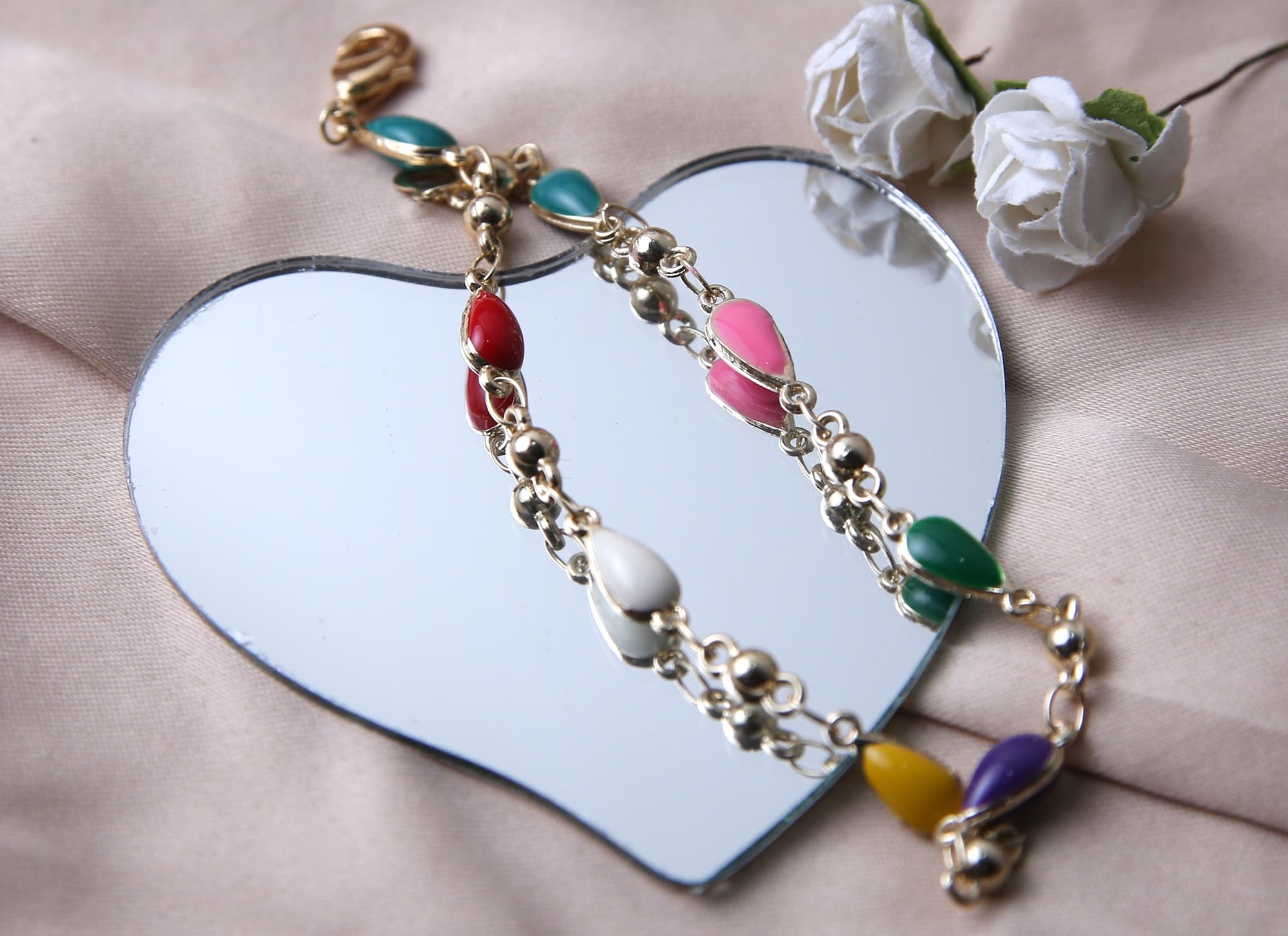 This is a chic anklet featuring vibrant teardrop-shaped charms in an array of colors, including teal, pink, red, green, white, purple, and yellow. The charms are connected by a delicate double gold chain with small golden beads, giving it a playful yet elegant look. The anklet is finished with a polished gold clasp for secure wear.