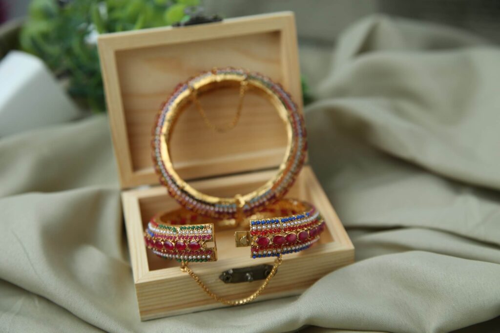 This stunning bangle set is a true masterpiece of Indian craftsmanship. Crafted with vibrant gemstones in various colors, these bangles are perfect for special occasions or as a statement piece. The detailed design and premium materials make this set an essential for any jewelry enthusiast.