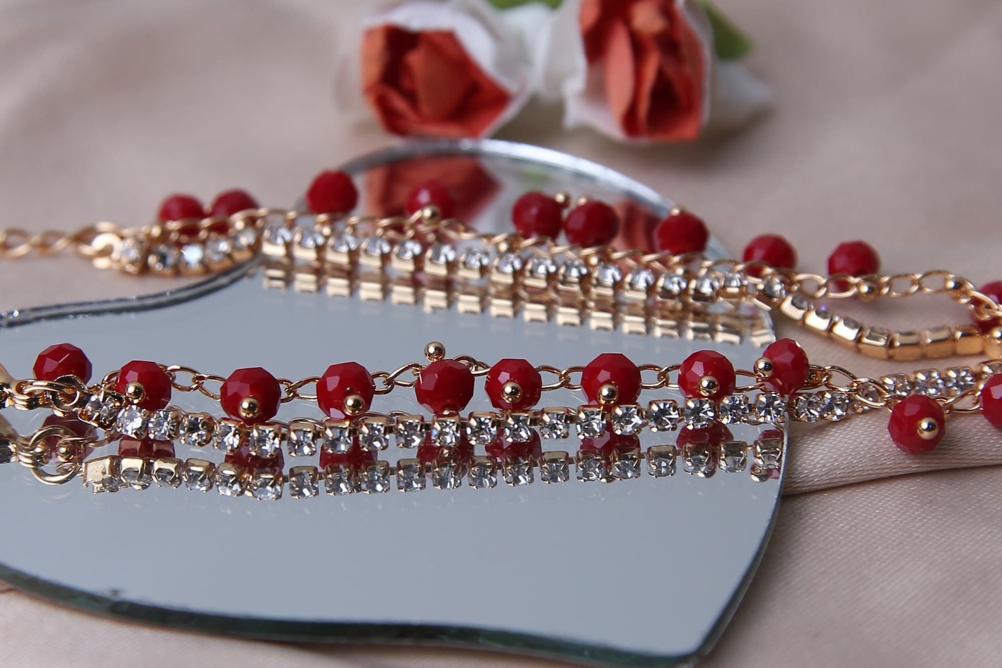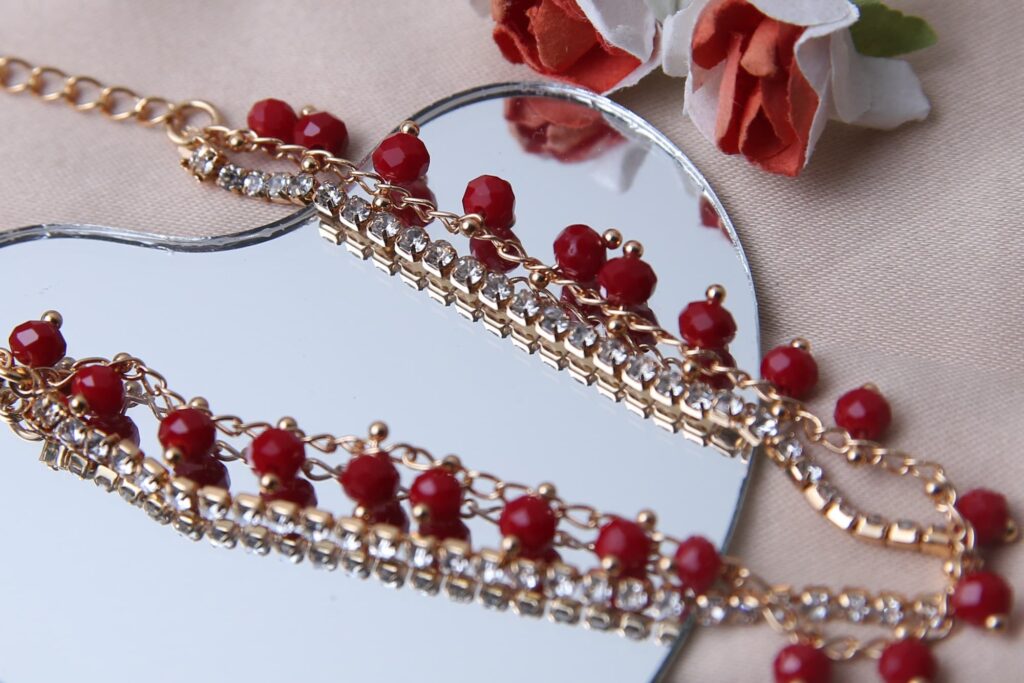 This stunning anklet features a delicate gold-toned chain adorned with sparkling red beads and shimmering rhinestone accents. The design is both elegant and glamorous, making it a perfect accessory for any special occasion.