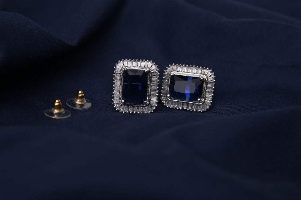 Transform your look with these magnificent Sapphire square stud earrings. The focus of each earring is a deep, rich blue rectangular sapphire, which is attractively framed by a brilliant array of baguette-cut crystals that shine with every movement. These earrings, made of sleek silver-tone metal, are designed to make you stand out at any occasion. They keep their luxury appearance while providing comfort thanks to secure push-back closures. These earrings are the ideal combination of refinement and glamour for a formal event or to dress up your everyday look.