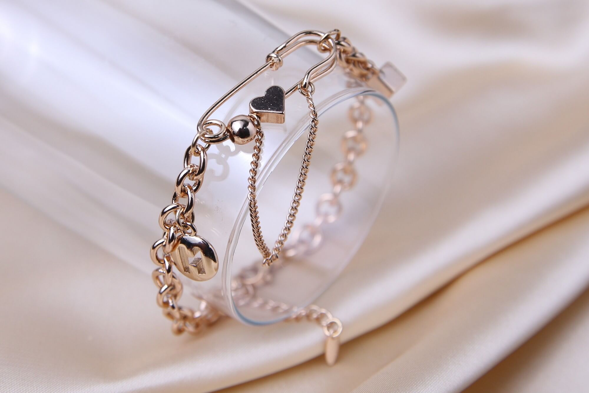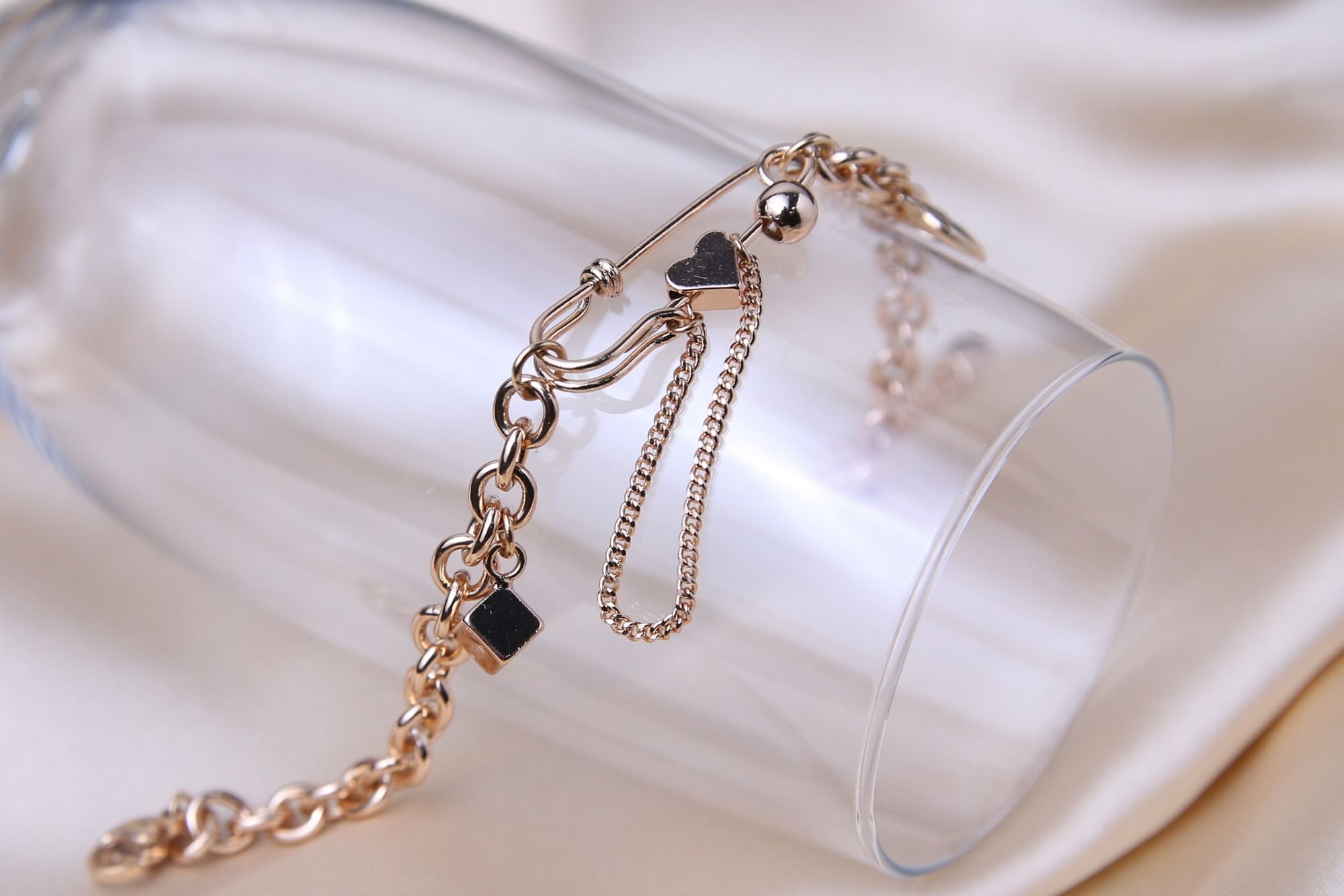 Make a bold statement with this unique bracelet. The rose gold chain features a stylish combination of heart and square charms, adding a touch of modern edge to classic elegance. The plating provides a luxurious shine, while the delicate chain ensures comfortable wear. This bracelet is perfect for adding a touch of personality to any outfit.