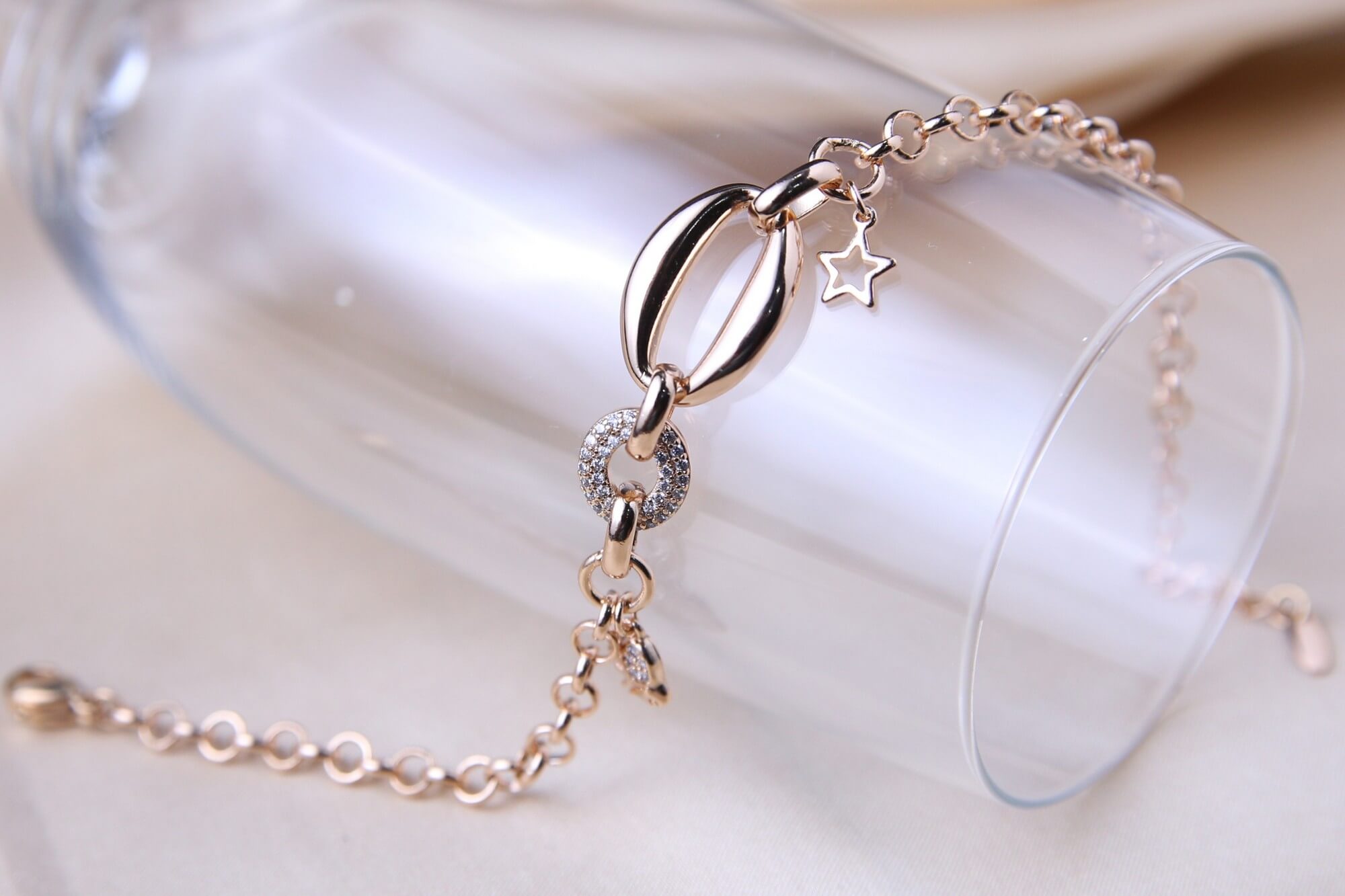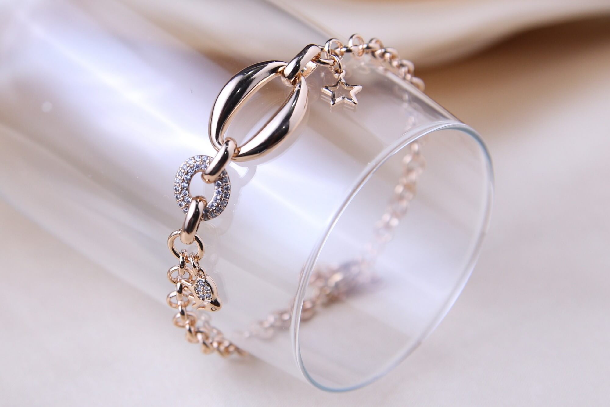 Add a touch of playful elegance to your wrist with this charming rose gold bracelet. Featuring a delicate chain adorned with unique charms, including a sparkling circle pavé-set with cubic zirconia, a sleek oval link, and a sweet star, this bracelet exudes a whimsical charm. The warm rose gold finish enhances the delicate details and subtle sparkle. The secure clasp ensures a comfortable and secure fit. Embrace a touch of delightful individuality with this lovely charm bracelet.
