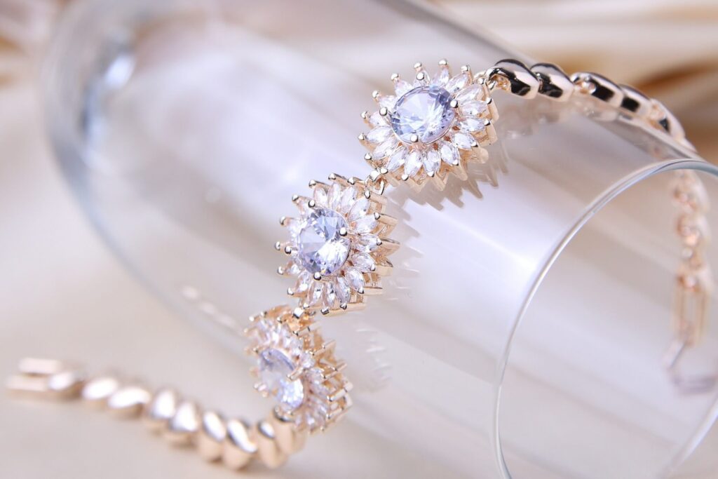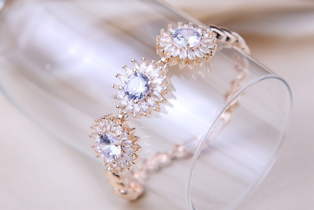 Embrace the beauty of blossoming elegance with this stunning rose gold bracelet. Featuring a series of exquisite floral designs, each centered with a larger, light-colored cubic zirconia stone and surrounded by radiating petals of smaller, sparkling zircon. The warm rose gold setting enhances the intricate details and the overall brilliance of the design. This bracelet adds a touch of sophisticated glamour to any occasion. The secure clasp ensures a comfortable and secure wear. Let your style bloom with this captivating floral bracelet.