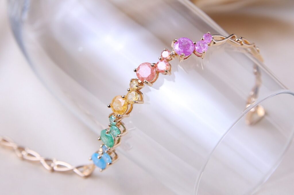 Celebrate a spectrum of vibrant hues with this enchanting rose gold bracelet. A delightful array of carefully selected gemstones in captivating shades of pink, yellow, green, and blue are gracefully set along a delicate and intricately designed rose gold chain. This playful yet elegant bracelet adds a touch of joyful color to any ensemble. The secure clasp ensures comfortable and secure wear. Embrace the beauty of the rainbow with this unique and eye-catching piece.