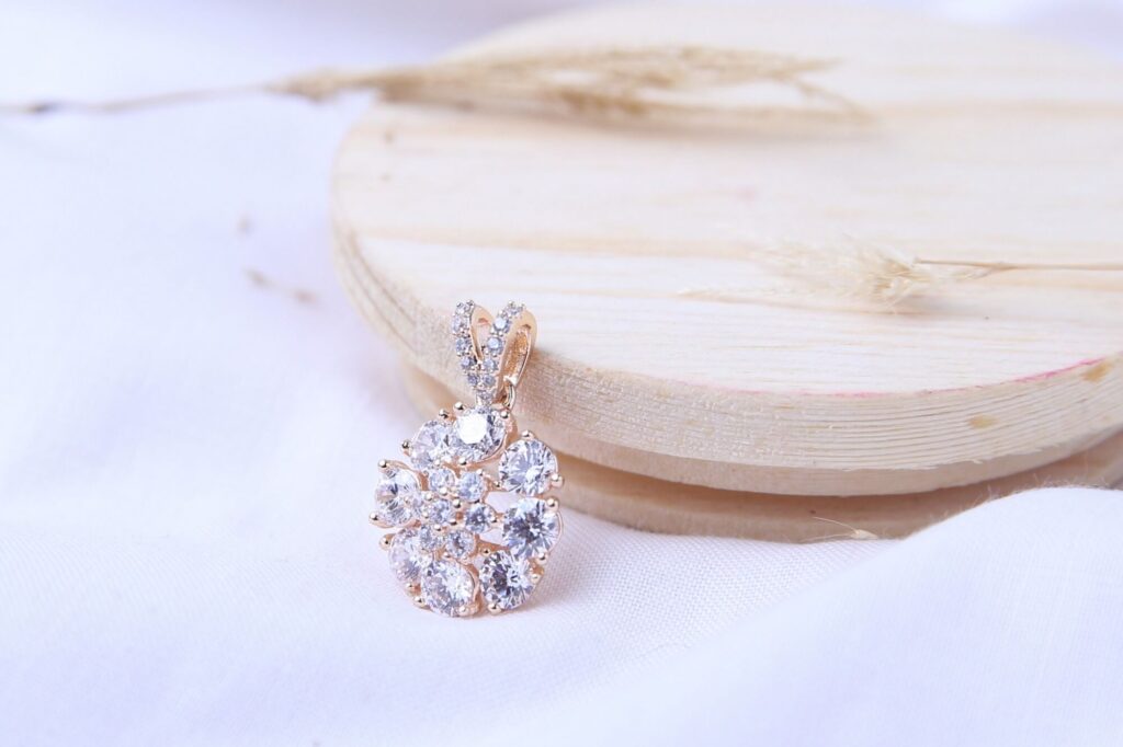 This captivating pendant necklace features a cluster of sparkling clear crystals arranged in a beautiful floral design. The varying sizes and cuts of the crystals create a dazzling play of light. The warm rose gold-toned setting enhances the brilliance of the stones and adds a touch of feminine elegance. This pendant is a perfect way to add a touch of radiant sparkle to any ensemble.