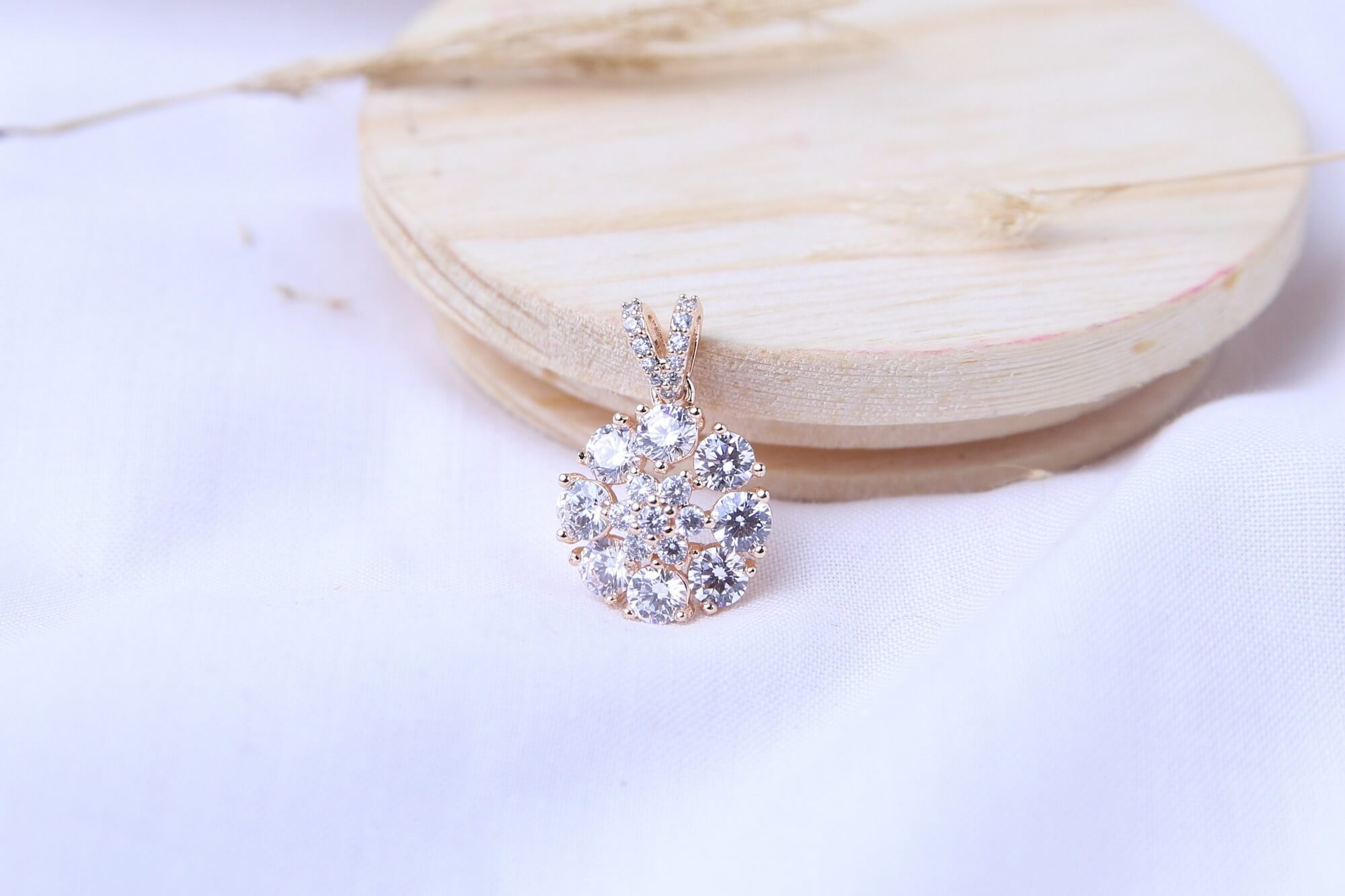 This captivating pendant necklace features a cluster of sparkling clear crystals arranged in a beautiful floral design. The varying sizes and cuts of the crystals create a dazzling play of light. The warm rose gold-toned setting enhances the brilliance of the stones and adds a touch of feminine elegance. This pendant is a perfect way to add a touch of radiant sparkle to any ensemble.
