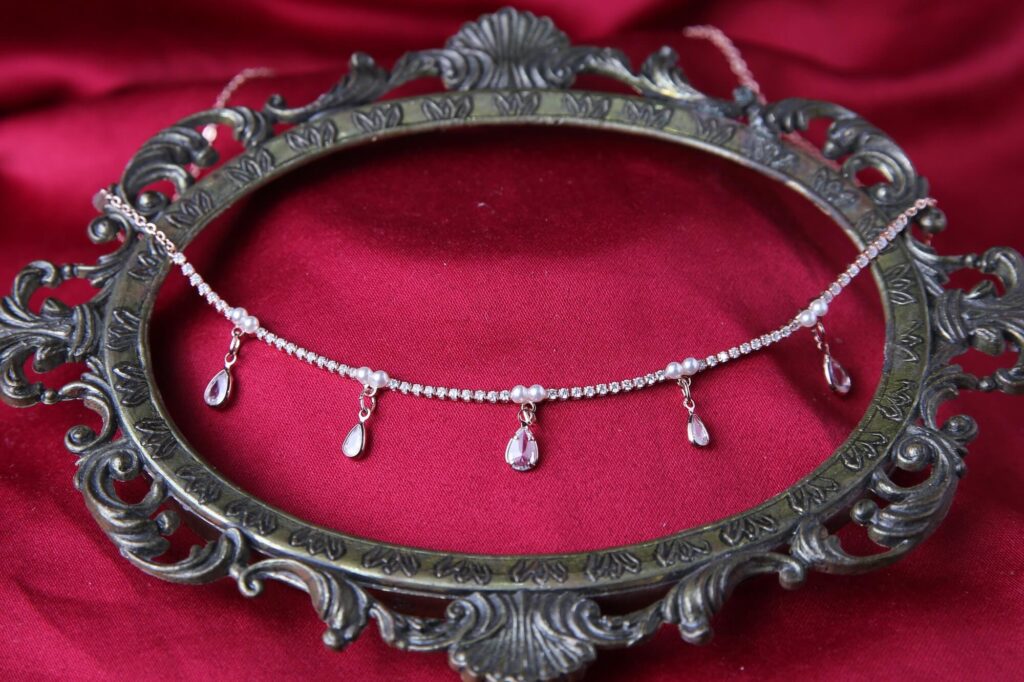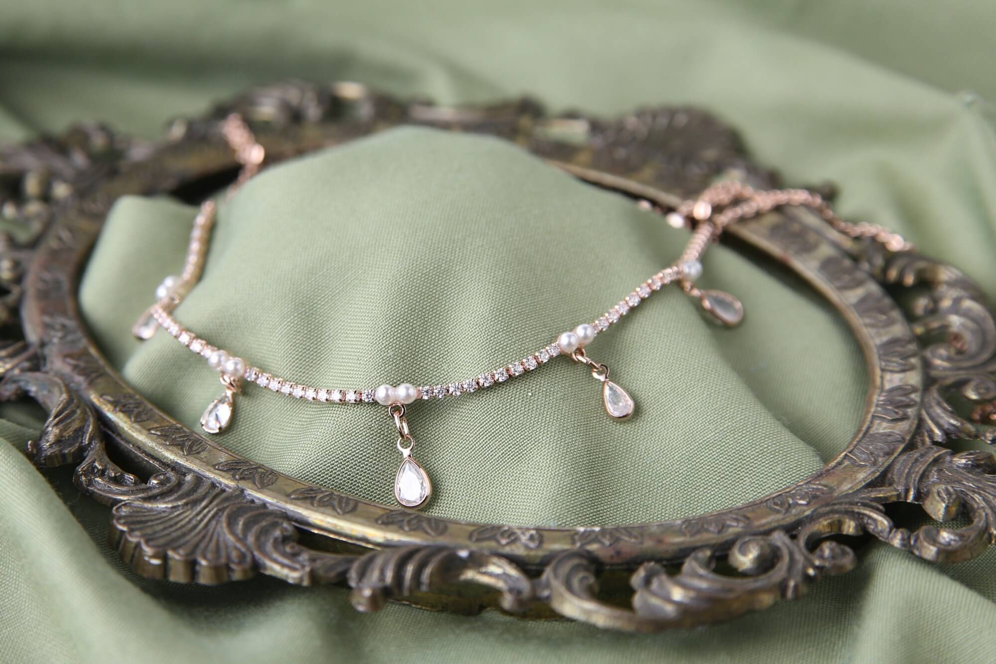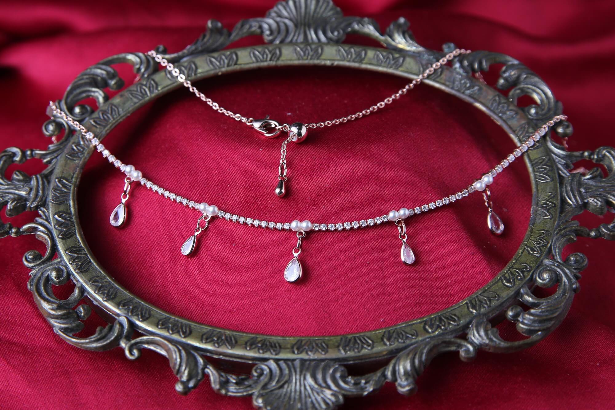 This exquisite layered choker necklace features a delicate rose gold-tone finish and a beautifully balanced design of pearls and cubic zirconia. The lower strand is a fine, sparkling chain, interspersed with tiny, brilliant stones and small, luminous faux pearls. Dangling gracefully from this strand are alternating clear crystal drops and small, round pearl drops, which catch the light and create a soft, ethereal movement. Secured with a lobster clasp and an adjustable extender, this piece offers a sophisticated blend of sparkle and classic elegance, making it an enchanting addition to any jewelry collection.