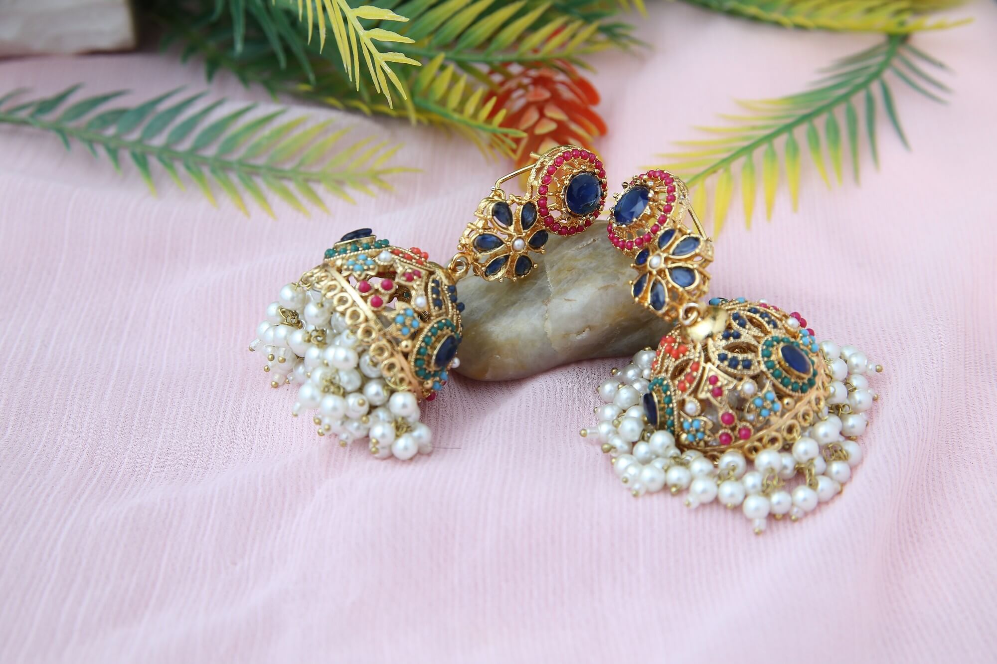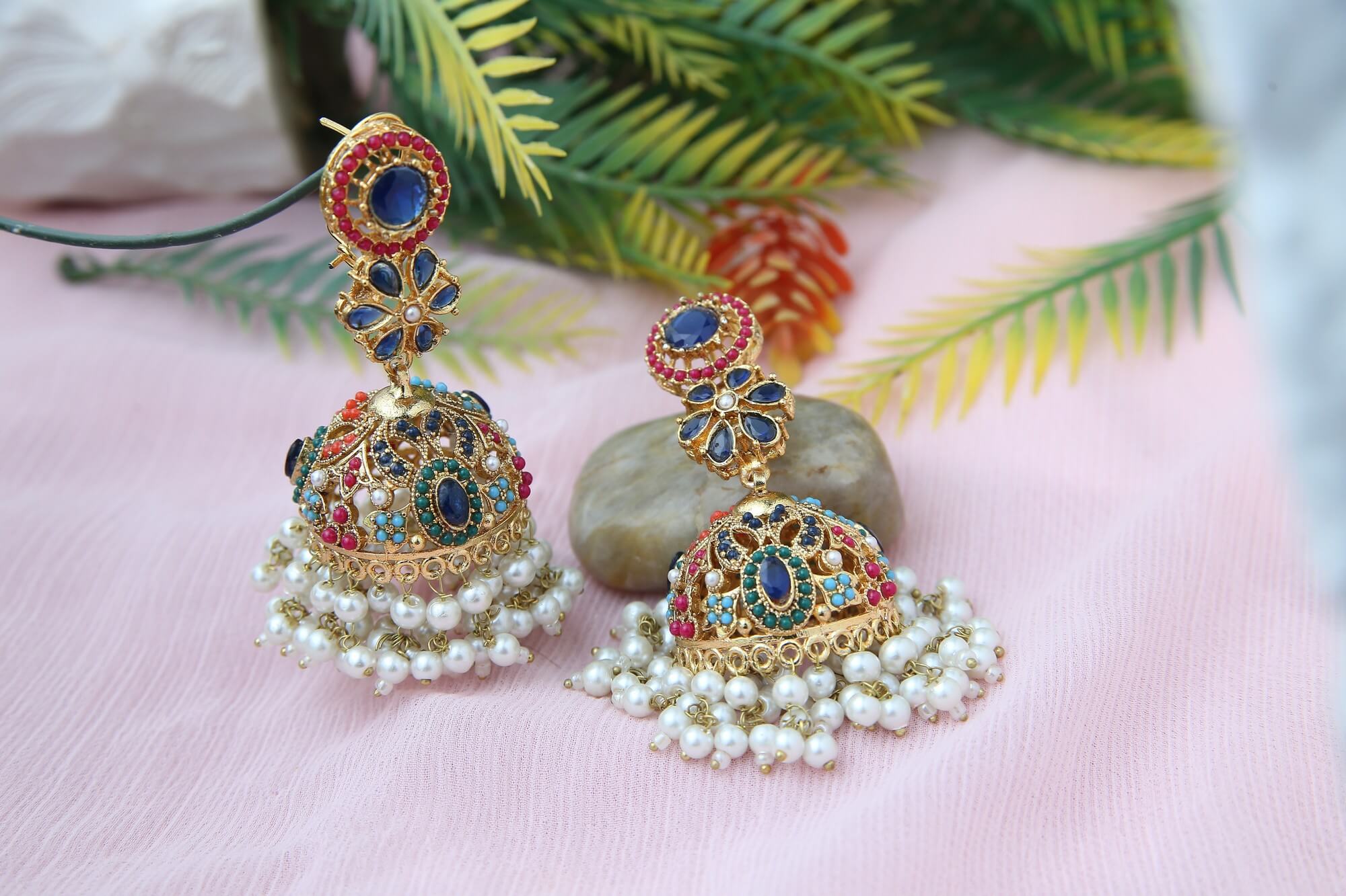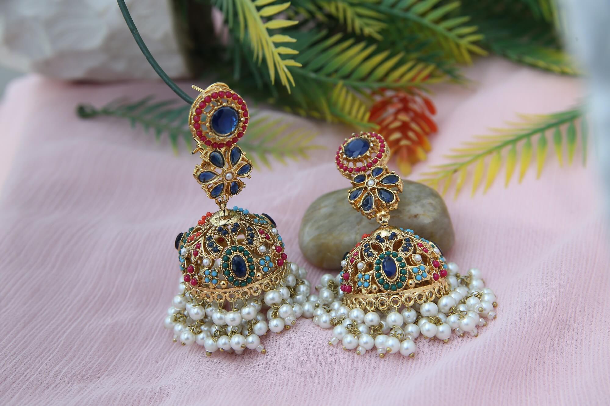 The traditional dome-shaped structure of the jhumkas is embellished with elaborate design, and the cascading pearls at the base add beautiful movement and sophistication to the entire look. These earrings are ideal for weddings, holiday gatherings, and any other special occasion, seamlessly combining classic charm with contemporary flair. The Royal Blue and Pearl Jhumka Earrings are lightweight yet eye-catching, and they are made to be comfortable enough to wear all day.