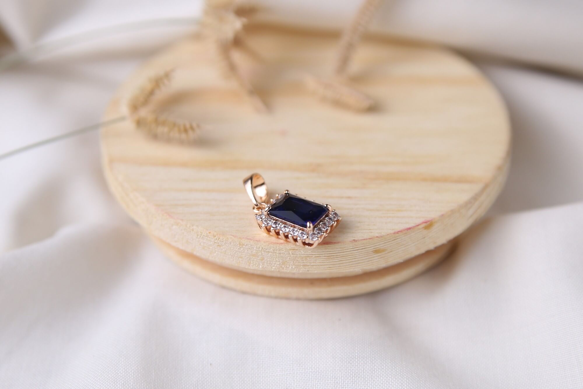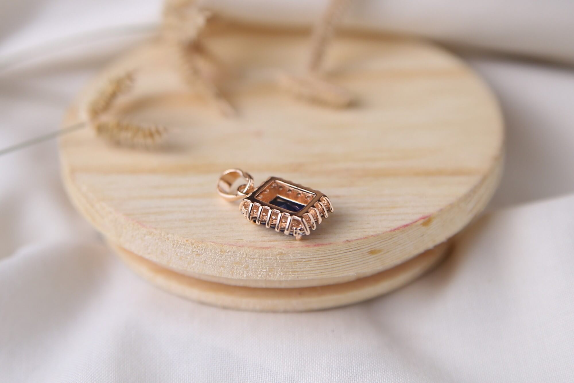 Exude regal elegance with this stunning emerald-cut pendant, a timeless addition to any jewelry collection. The focal point is a deep sapphire black stone, precision-cut to showcase its rich, velvet-like color. This captivating center is framed by a shimmering halo of brilliant clear cubic zirconia stones, which add a layer of classic sophistication and enhanced radiance. Crafted with a warm rose gold-tone finish, this pendant offers a perfect blend of vintage charm and modern luxury. Its clean lines and bold color make it an ideal choice for a sophisticated evening look or as a standout signature piece for everyday wear.