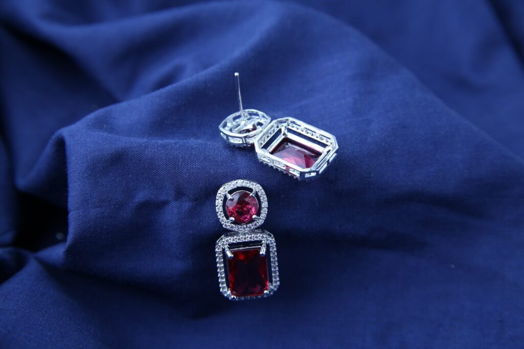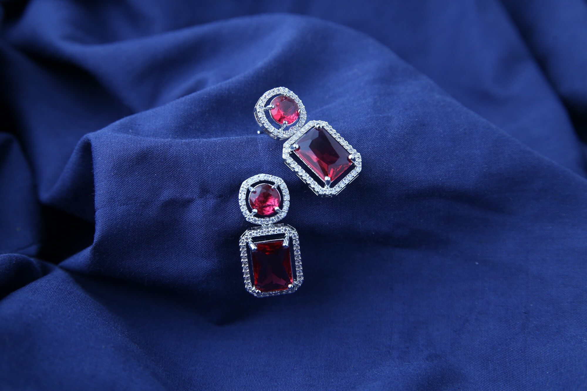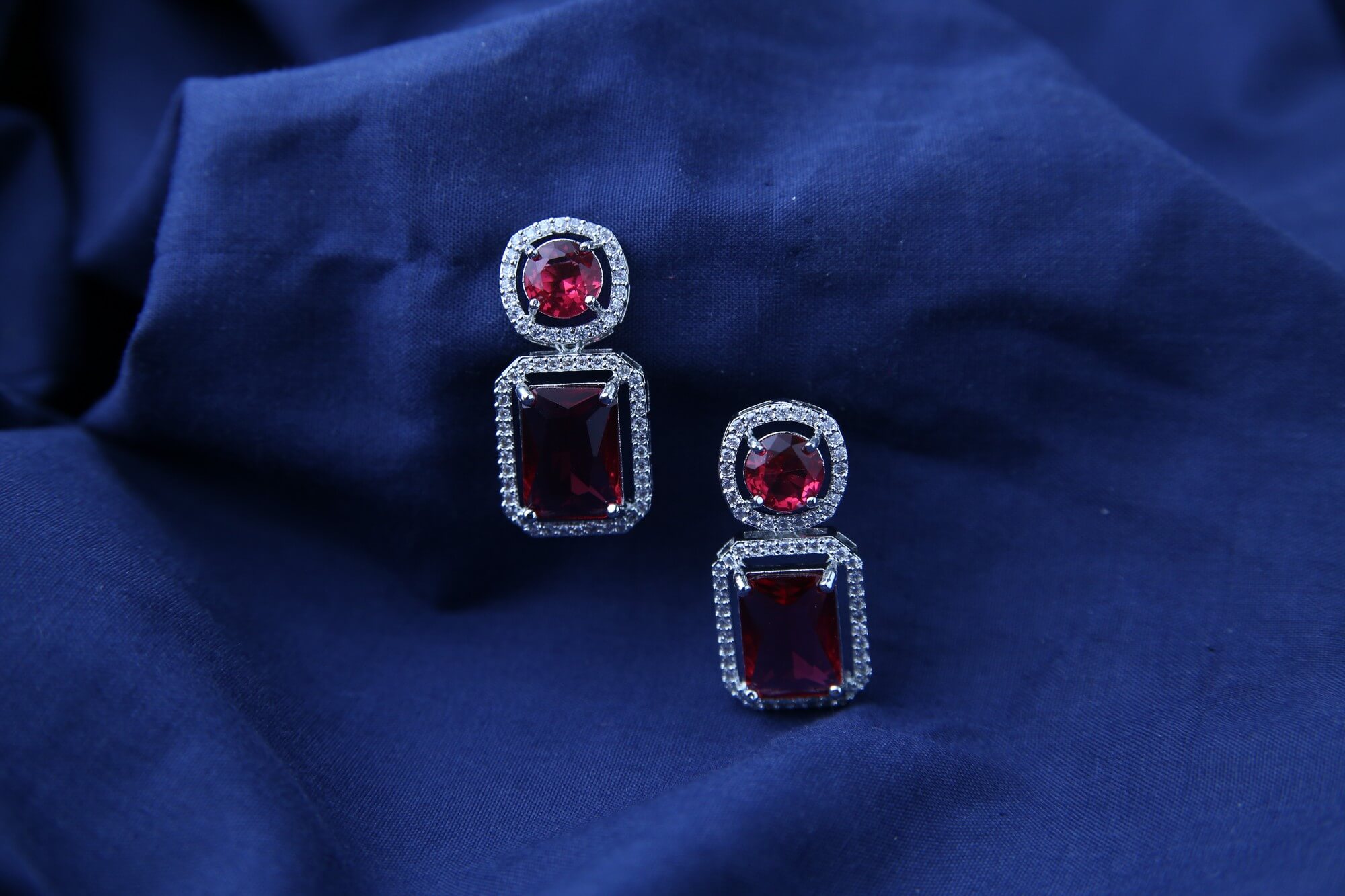 Indulge in the allure of timeless elegance with these captivating crimson drop earrings. Each earring features a mesmerizing deep red ruby, exuding a rich and luxurious hue. The vibrant rubies are expertly cut into elegant rectangular and oval shapes, catching the light with every turn. Surrounding the luscious rubies, a delicate halo of sparkling white diamonds adds a touch of brilliance and enhances the fiery red tones. The contrast between the vivid rubies and the icy diamonds creates a visually stunning and sophisticated look.