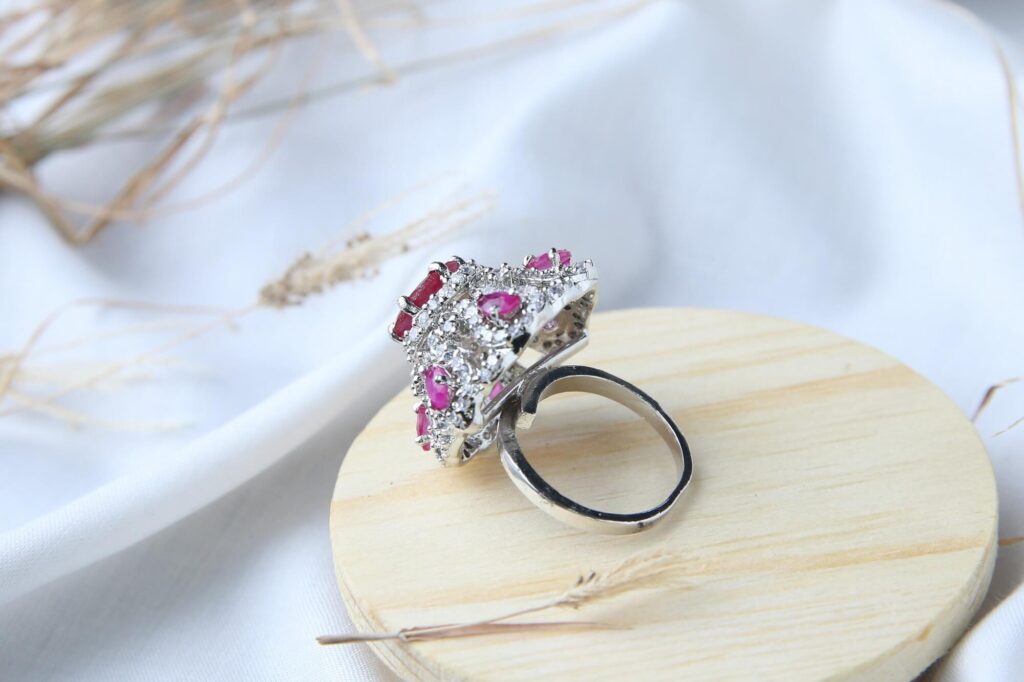 This vibrant cocktail ring showcases multiple pink ruby gemstones arranged in an intricate openwork design. The center features a larger oval ruby surrounded by smaller round rubies, all set against a brilliant diamond-studded backdrop. The three-dimensional design creates depth and movement, making this piece a true conversation starter.