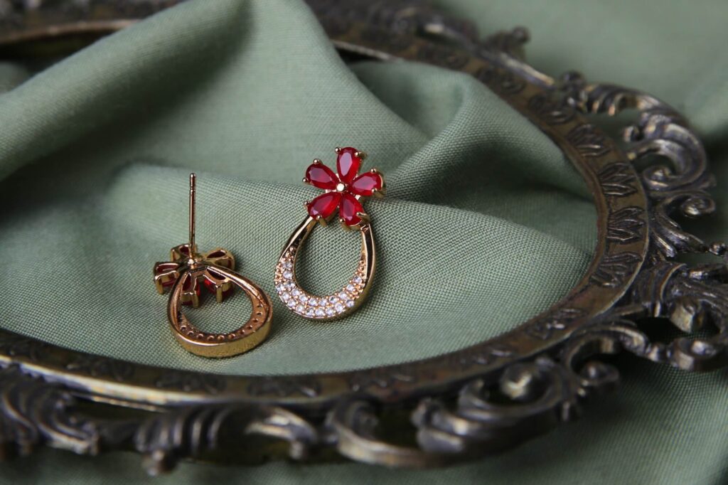These luxurious earrings feature vibrant red gemstones arranged in a floral pattern at the top. Below the flower sits a teardrop-shaped gold base embellished with small clear crystals. The combination of the deep red stones and sparkling accents creates a dramatic effect. Their elegant design makes them ideal for evening wear.