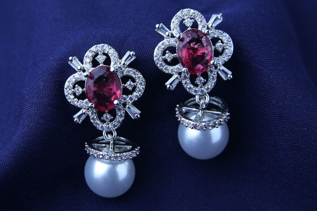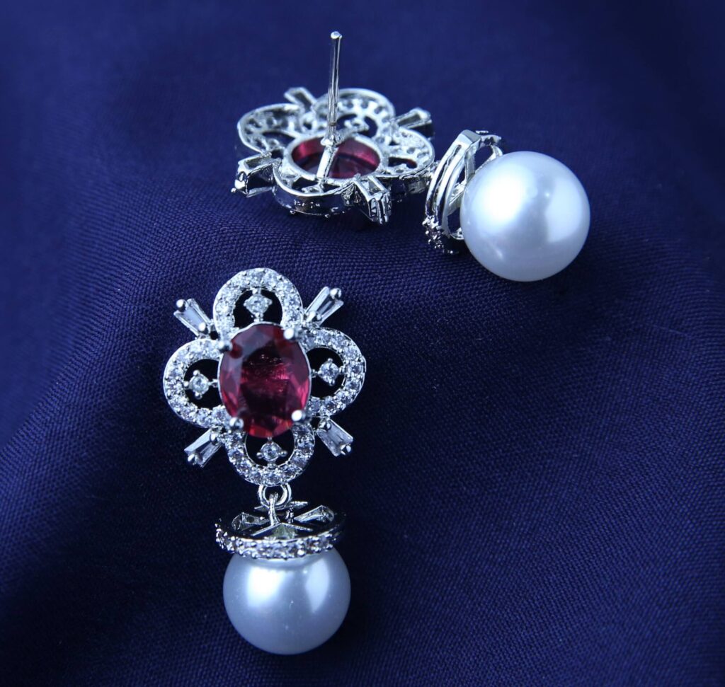 Embrace the beauty of nature with these Ruby Pearl Blossom Earrings. Delicate floral designs, crafted with shimmering crystals, form the centerpiece of these elegant earrings. A vibrant ruby stone glows at the heart of each blossom, adding a touch of rich color and captivating depth. A lustrous pearl dangles gracefully below, completing the sophisticated and feminine design. These earrings are the perfect accessory for adding a touch of glamour and natural charm to any occasion.
