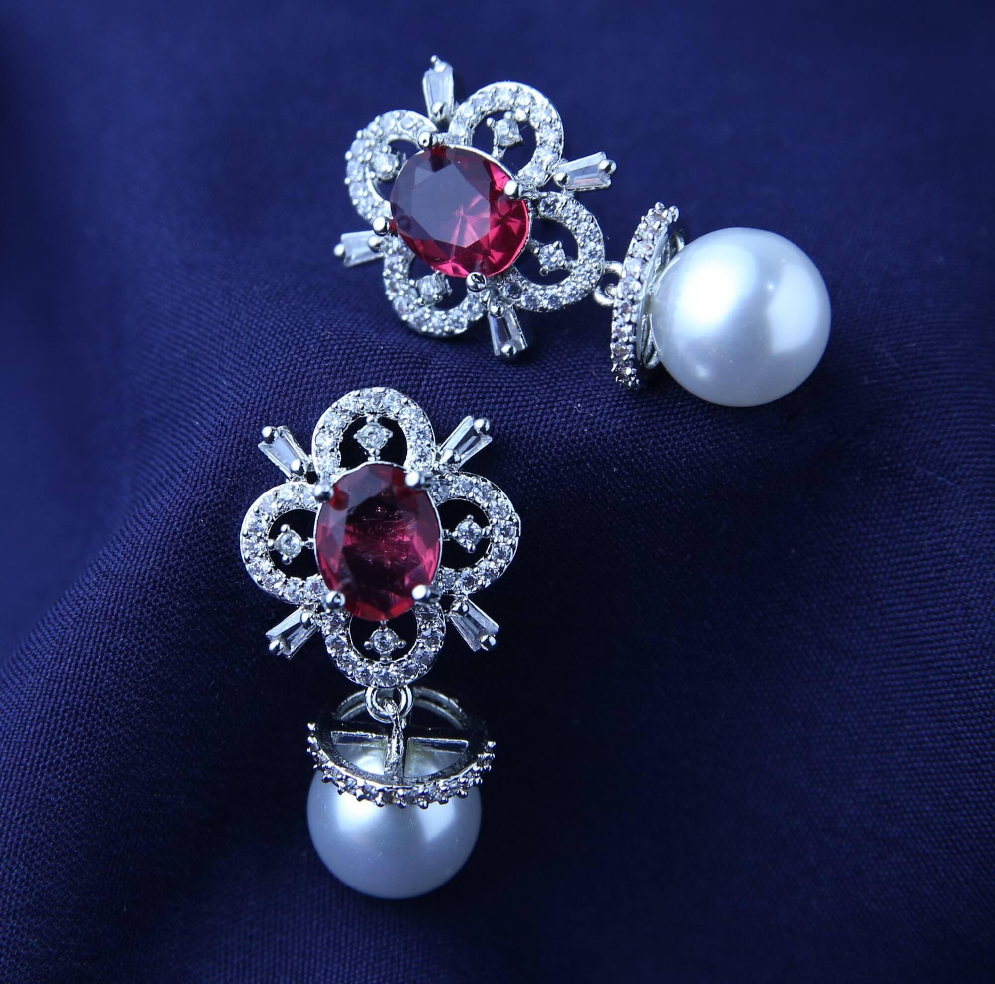 Embrace the beauty of nature with these Ruby Pearl Blossom Earrings. Delicate floral designs, crafted with shimmering crystals, form the centerpiece of these elegant earrings. A vibrant ruby stone glows at the heart of each blossom, adding a touch of rich color and captivating depth. A lustrous pearl dangles gracefully below, completing the sophisticated and feminine design. These earrings are the perfect accessory for adding a touch of glamour and natural charm to any occasion.