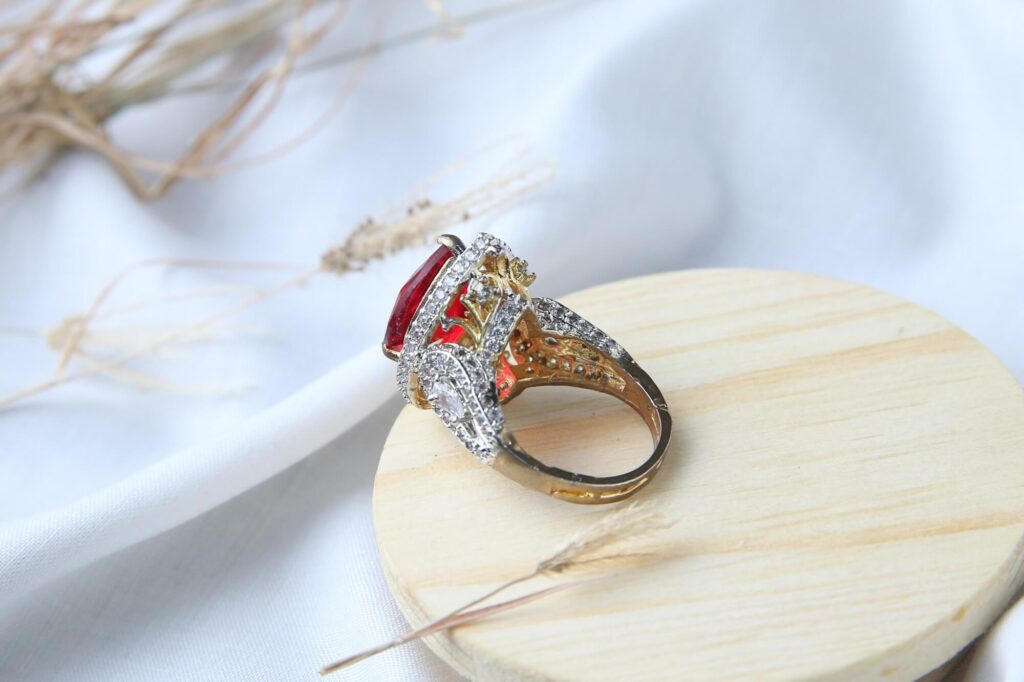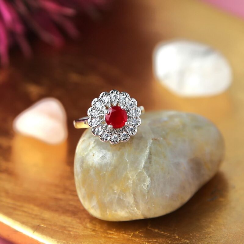 Exuding timeless glamour, this stunning ring features a rich ruby-red teardrop centerpiece surrounded by a brilliant diamond halo. The mixed-metal setting enhances the depth of the vibrant center stone, while elegant side accents add extra dimension. Perfect for making a sophisticated statement, this ring combines classic design elements with contemporary styling for versatile, eye-catching appeal.