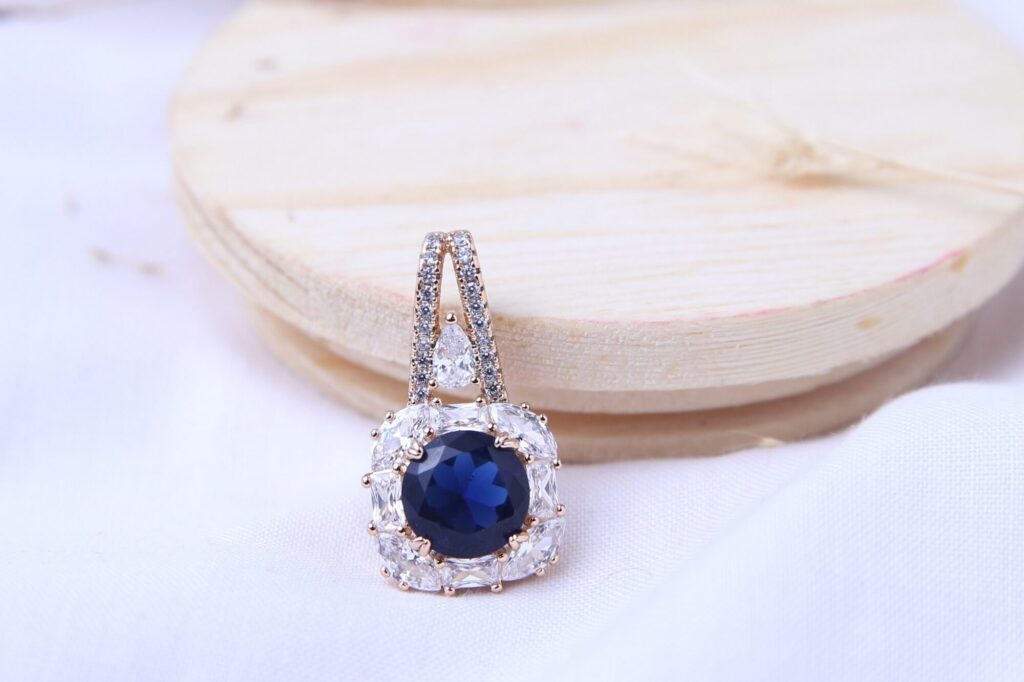 Indulge in the captivating beauty of this exquisite pendant necklace. A deep, oval-cut sapphire takes center stage, surrounded by a dazzling halo of clear, sparkling crystals. The warm rose gold-toned setting enhances the rich blue hue of the sapphire and the brilliance of the surrounding crystals. The pendant gracefully suspends from a delicate, matching chain, creating a timeless piece perfect for adding a touch of sophisticated glamour to any occasion.
