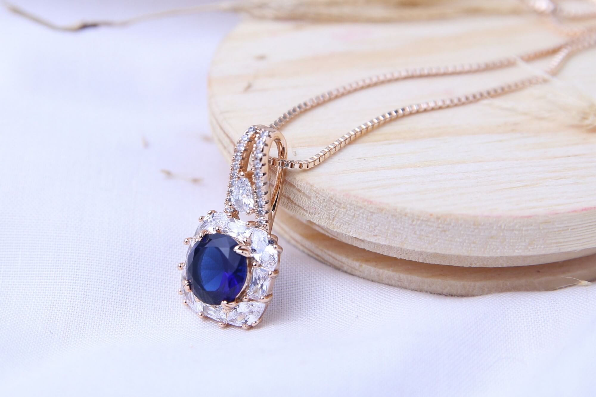 Indulge in the captivating beauty of this exquisite pendant necklace. A deep, oval-cut sapphire takes center stage, surrounded by a dazzling halo of clear, sparkling crystals. The warm rose gold-toned setting enhances the rich blue hue of the sapphire and the brilliance of the surrounding crystals. The pendant gracefully suspends from a delicate, matching chain, creating a timeless piece perfect for adding a touch of sophisticated glamour to any occasion.