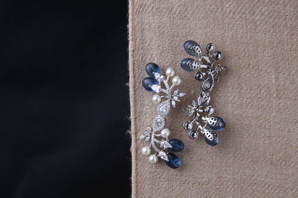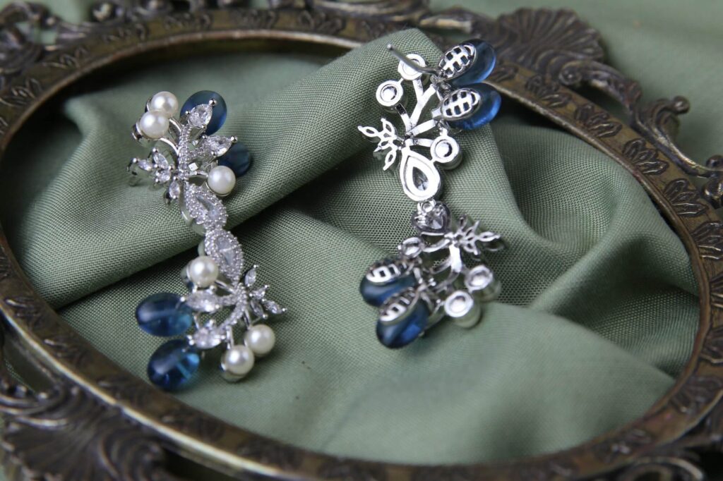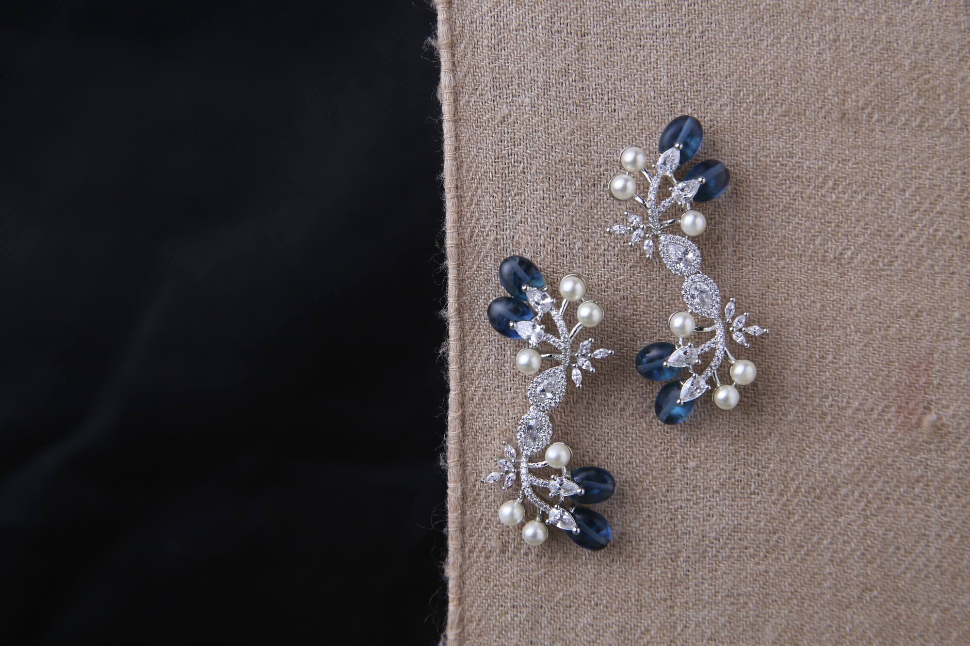 These sophisticated drop earrings feature an enchanting botanical design with deep blue oval sapphires complemented by lustrous white pearls. The silver-tone setting is adorned with clear crystal accents arranged in delicate leaf patterns. These nature-inspired pieces blend classic elegance with contemporary styling, perfect for special occasions.