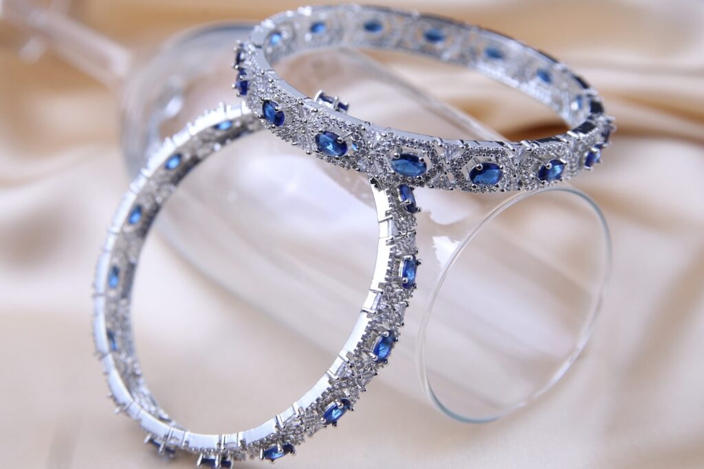 Adorn your wrists with the captivating allure of this exquisite bangle set. Each bangle features a series of vibrant blue sapphire-hued stones, alternating with sparkling clear crystals. The bright silver-toned setting enhances the brilliance of the stones, creating a luxurious and eye-catching effect. This set is perfect for adding a touch of sophisticated glamour to any ensemble.