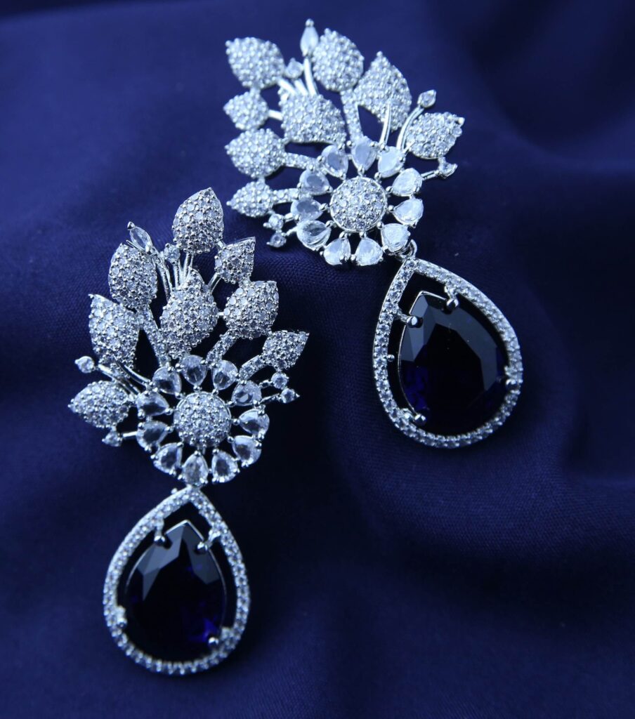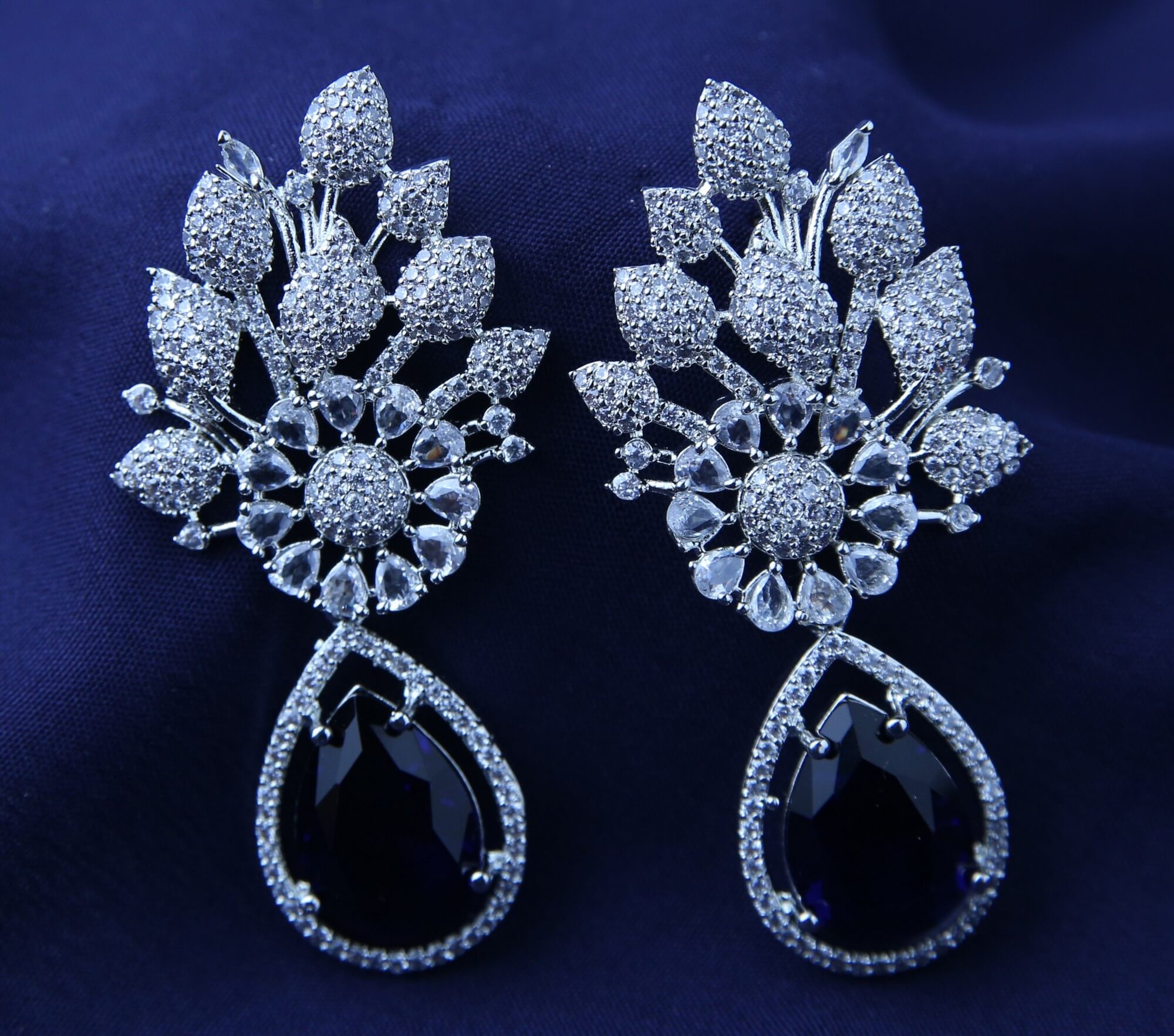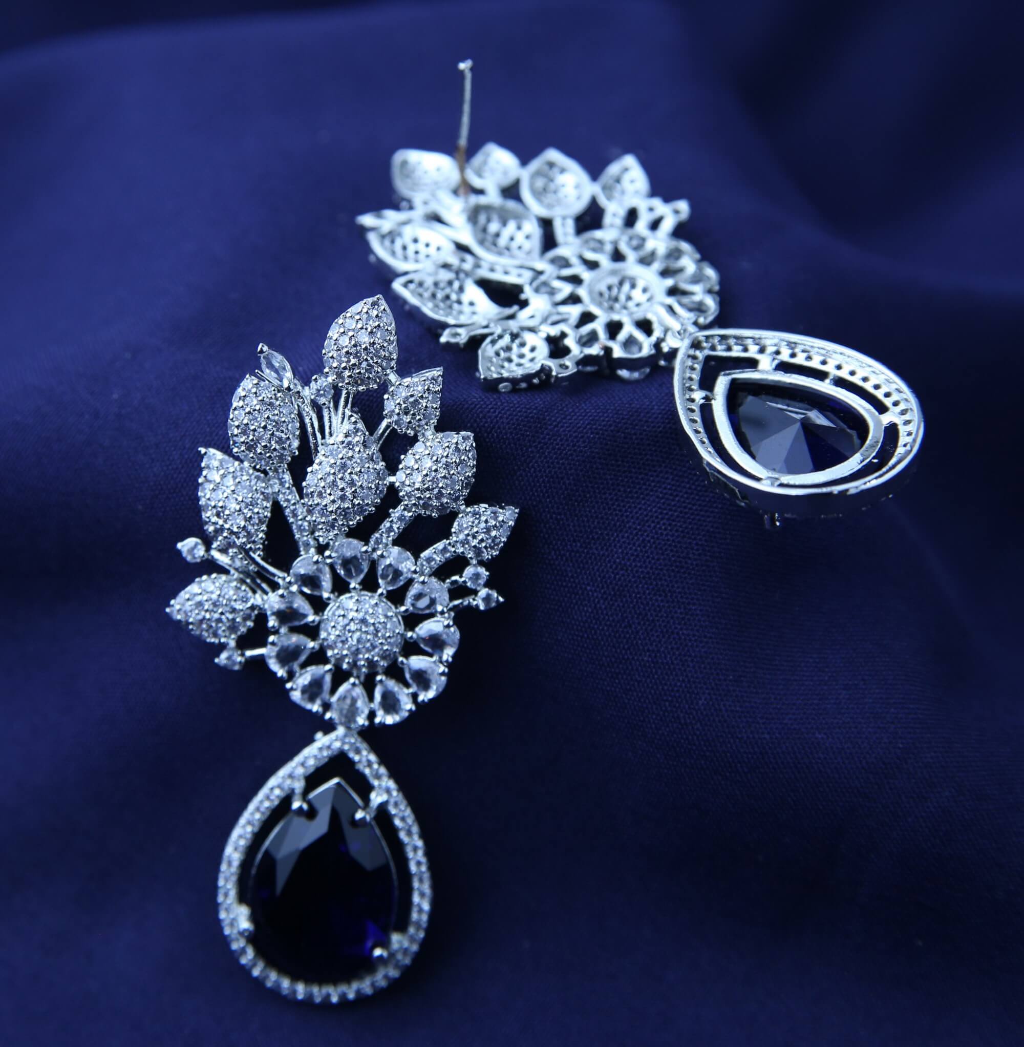 Capture the magic of a starligt night with these Sapphire Starlight Earrings. Delicate clusters of shimmering crystals form a celestial bloom design, adding a touch of ethereal sparkle. A captivating, teardrop-shaped sapphire stone dangles gracefully below, its deep blue hue reminiscent of the night sky. These earrings are the perfect accessory for adding a touch of celestial glamour to any occasions.