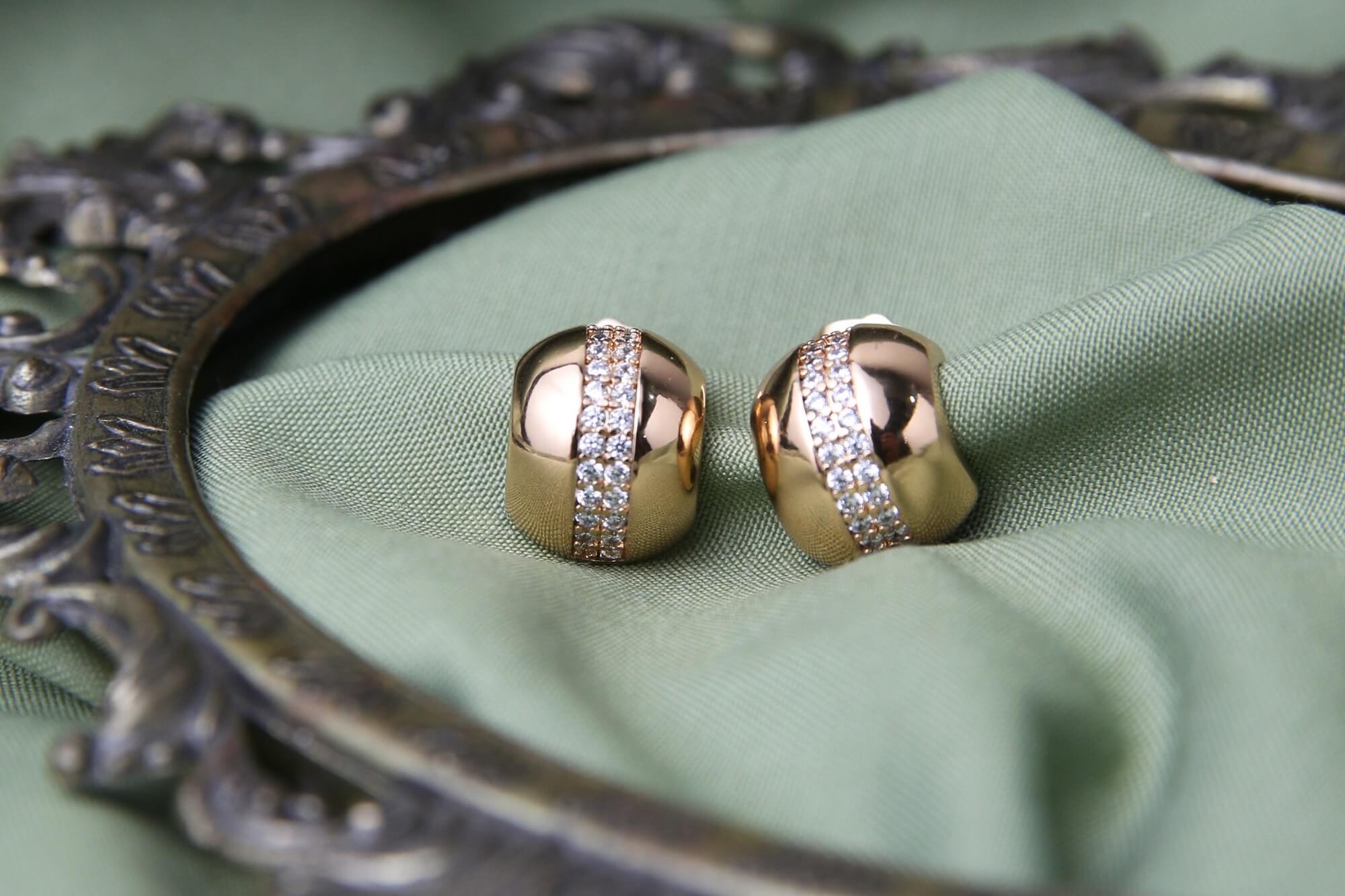 These uniquely designed stud earrings offer a touch of modern sophistication. Each earring features a smooth, polished gold-toned dome accented by a vertical band of dazzling clear crystals. The sculpted form catches the light beautifully, adding a subtle yet glamorous sparkle. These earrings are a perfect way to elevate your everyday style or add a contemporary edge to a more formal look.
