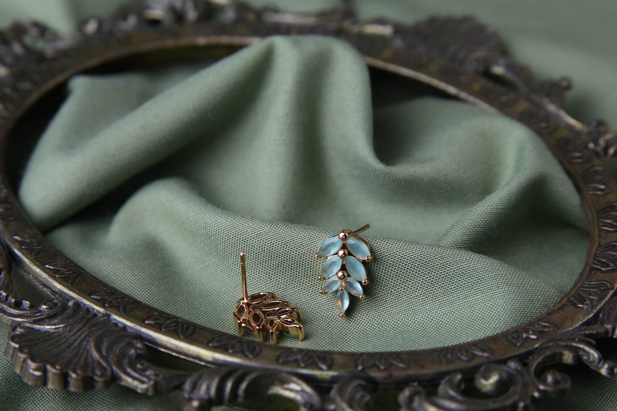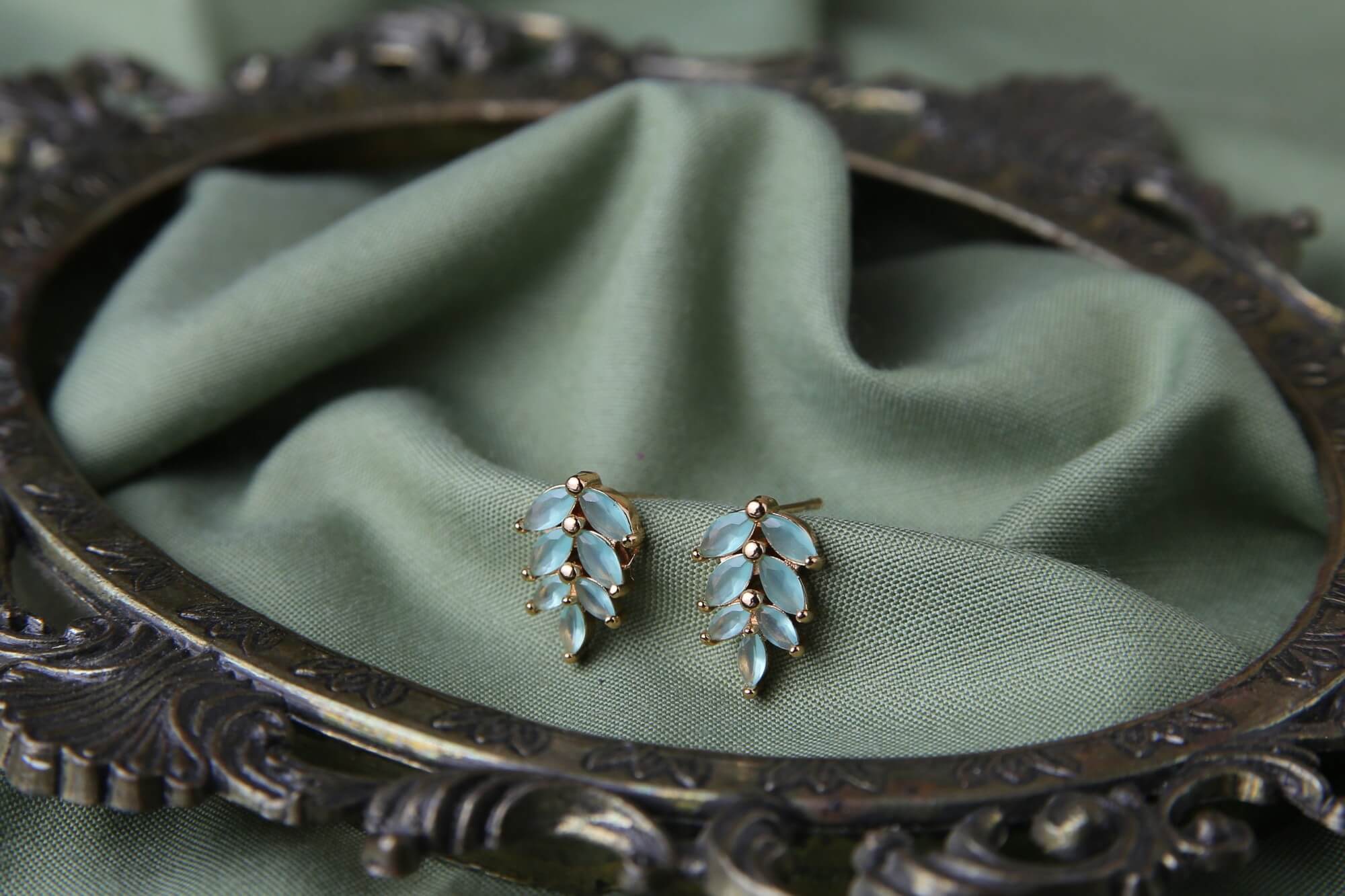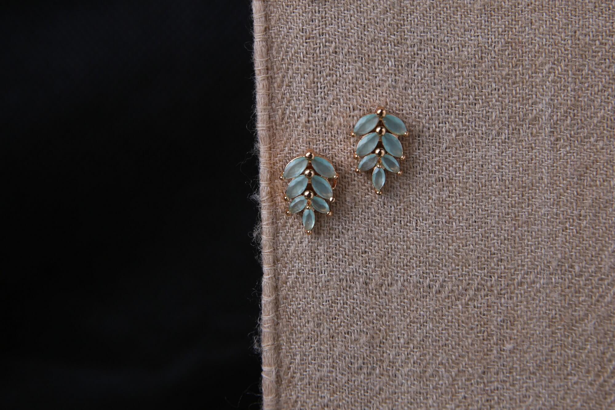 These enchanting aqua blue leaf stud earrings radiate tranquility and elegance. Featuring marquise-cut gemstones in a soft blue hue, the delicate leaf-inspired design is set in a warm gold-tone frame, creating a perfect balance of sophistication and charm. The calming blue tones symbolize serenity and grace, making these earrings a versatile choice for both casual and formal occasions. Lightweight and timeless, they offer a subtle yet refined touch to any outfit, making them a must-have addition to your jewelry collection.