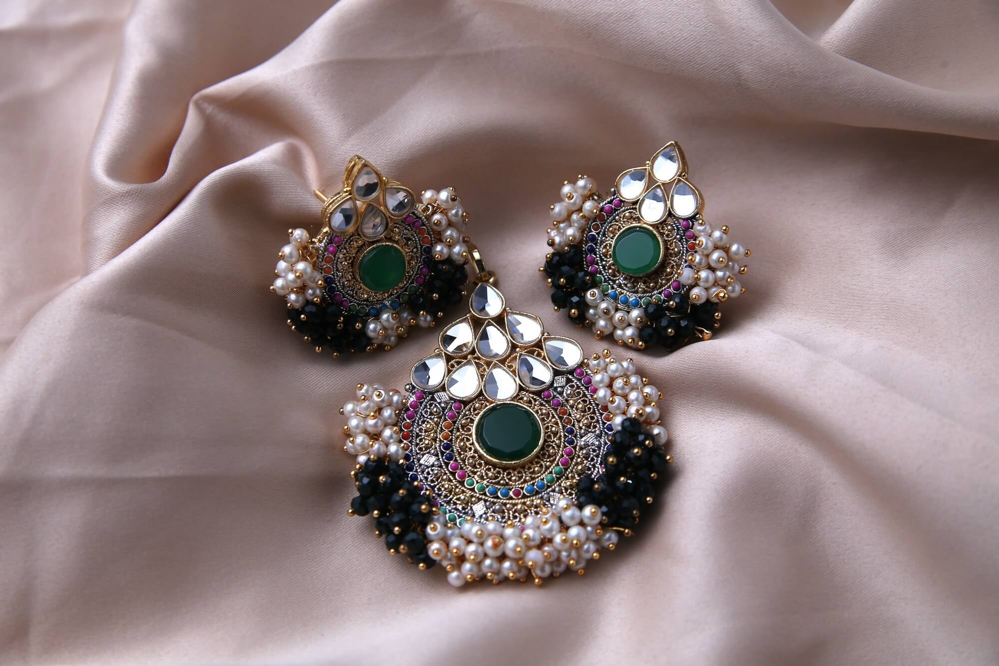 This exquisite jewelry set has an emerald gemstone that is encircled by fine goldwork. An elegant and luxurious combination is achieved through the delicate goldwork embellished with glittering pearls and sparkling gemstones. An air of regal grandeur is added to the ensemble by the emerald, a sign of knowledge and rebirth.. This classic piece is perfect for regular wear or special occasions. It will definitely make an impression.