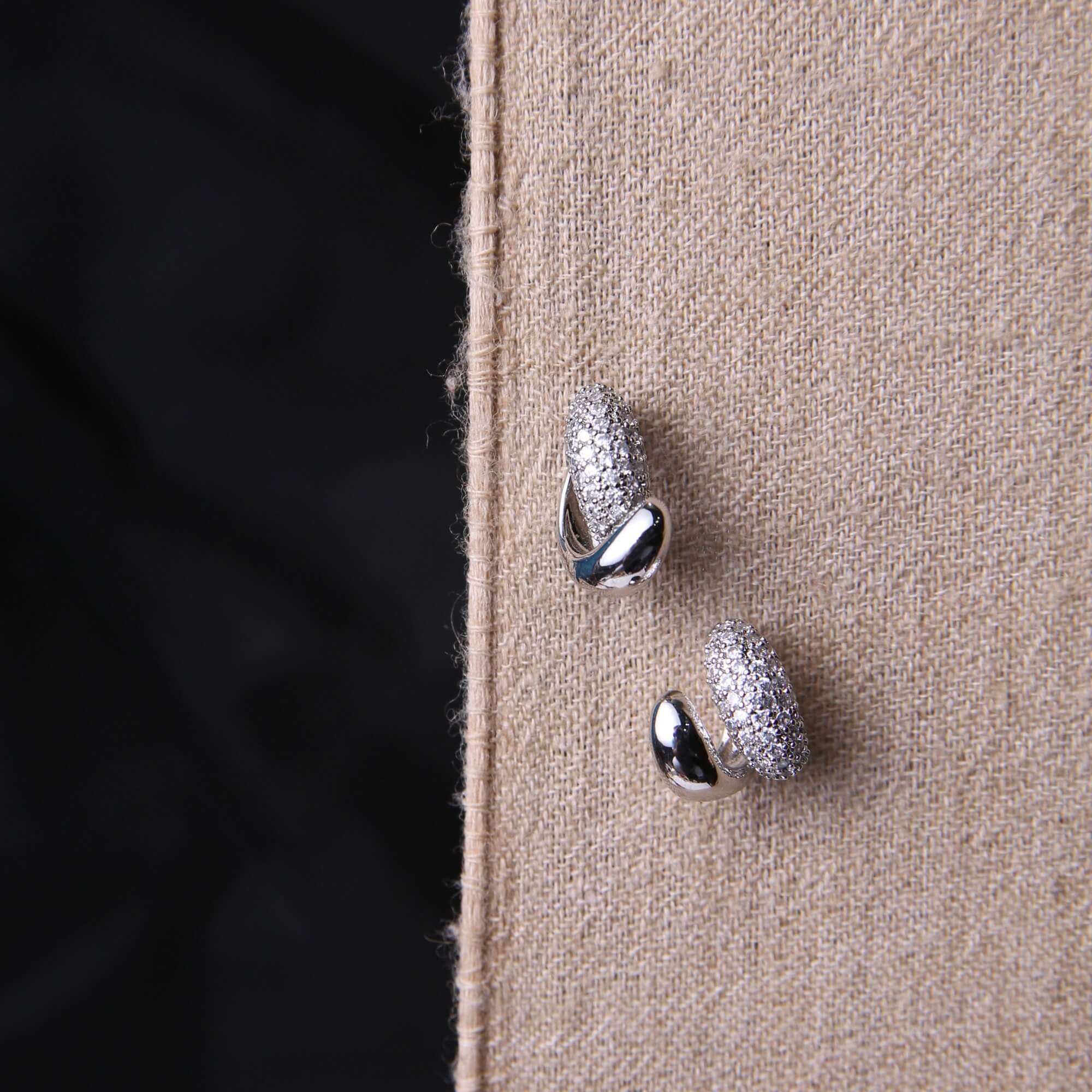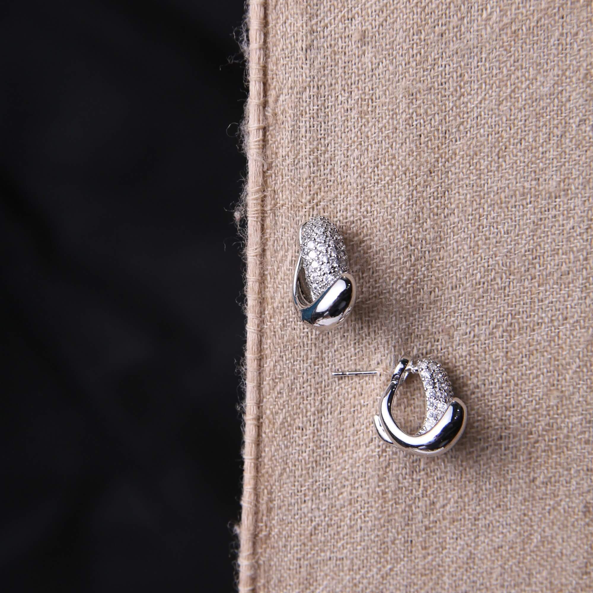 Modern design meets high-shine glamour in these unique sculptural huggie earrings. Crafted with a sleek, polished silver finish, each earring features a dynamic, two-textured design: one half consists of a smooth, high-polish liquid metal curve, while the other is encrusted with a dense crusted pave of brilliant zirconia stones. This striking contrast creates a bold, multi-dimensional look that wraps elegantly around the earlobe. Perfect for adding an edgy yet sophisticated touch to your jewelry stack, these silver huggies are a contemporary essential for those who love avant-garde luxury.