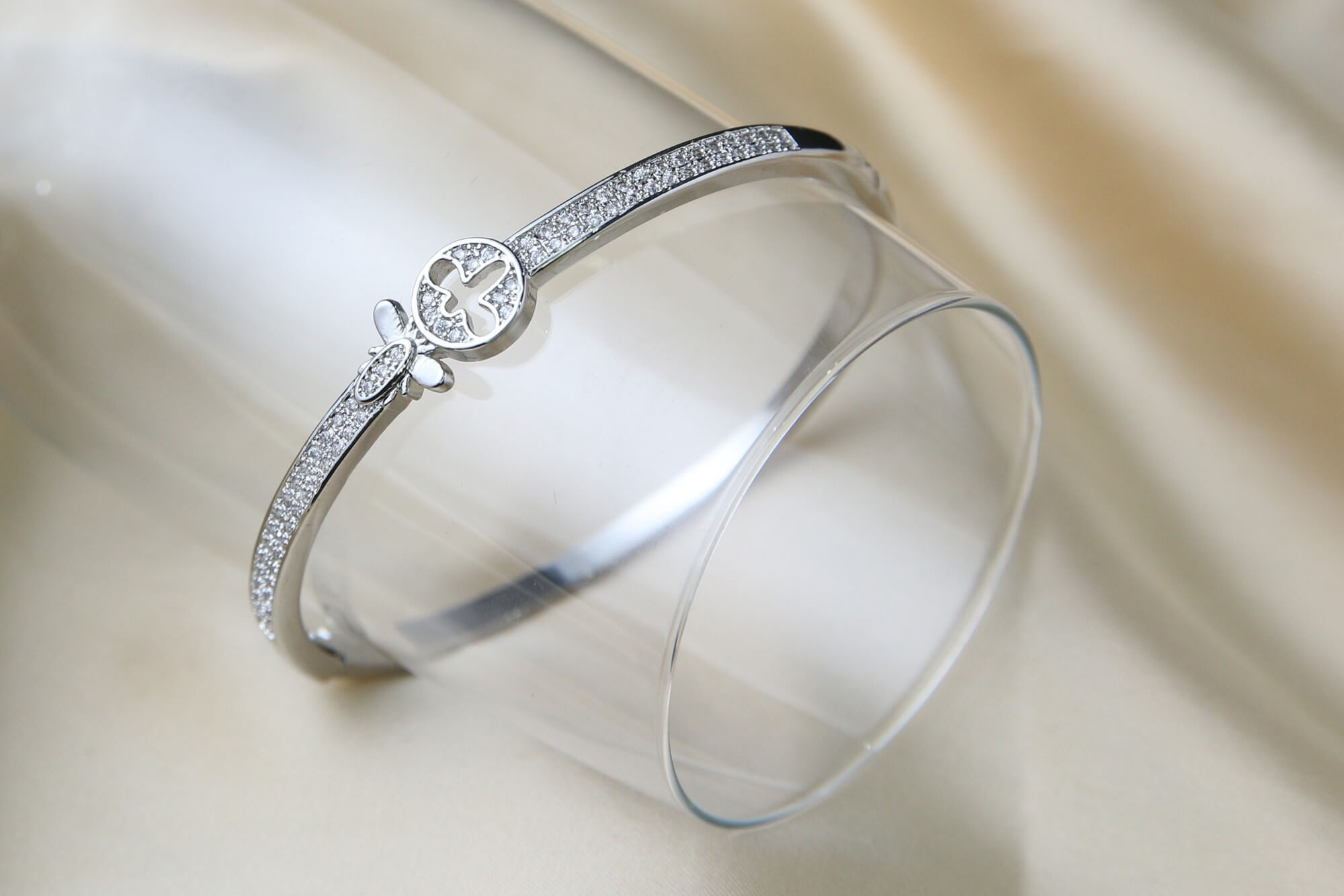 Adorn your wrist with the understated elegance of this silver-tone bangle bracelet, a perfect blend of modern design and classic sparkle. This sleek bangle features a delicate, circular motif at its center, accented with a subtle butterfly detail, both adorned with shimmering crystal accents. The thin band is also lined with a continuous row of crystals, catching the light with every movement and adding a touch of refined glamour to any ensemble. Its versatile design makes it suitable for attending a festive gathering or enjoying a day out. This bracelet is not only a chic accessory but also a thoughtful gift that conveys sophistication and charm. Consider gifting this exquisite piece to a special woman in your life or elevate your own jewelry collection with its timeless beauty.