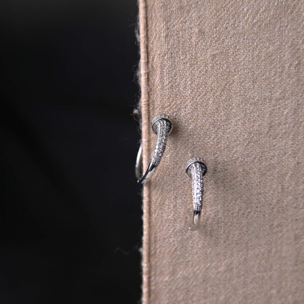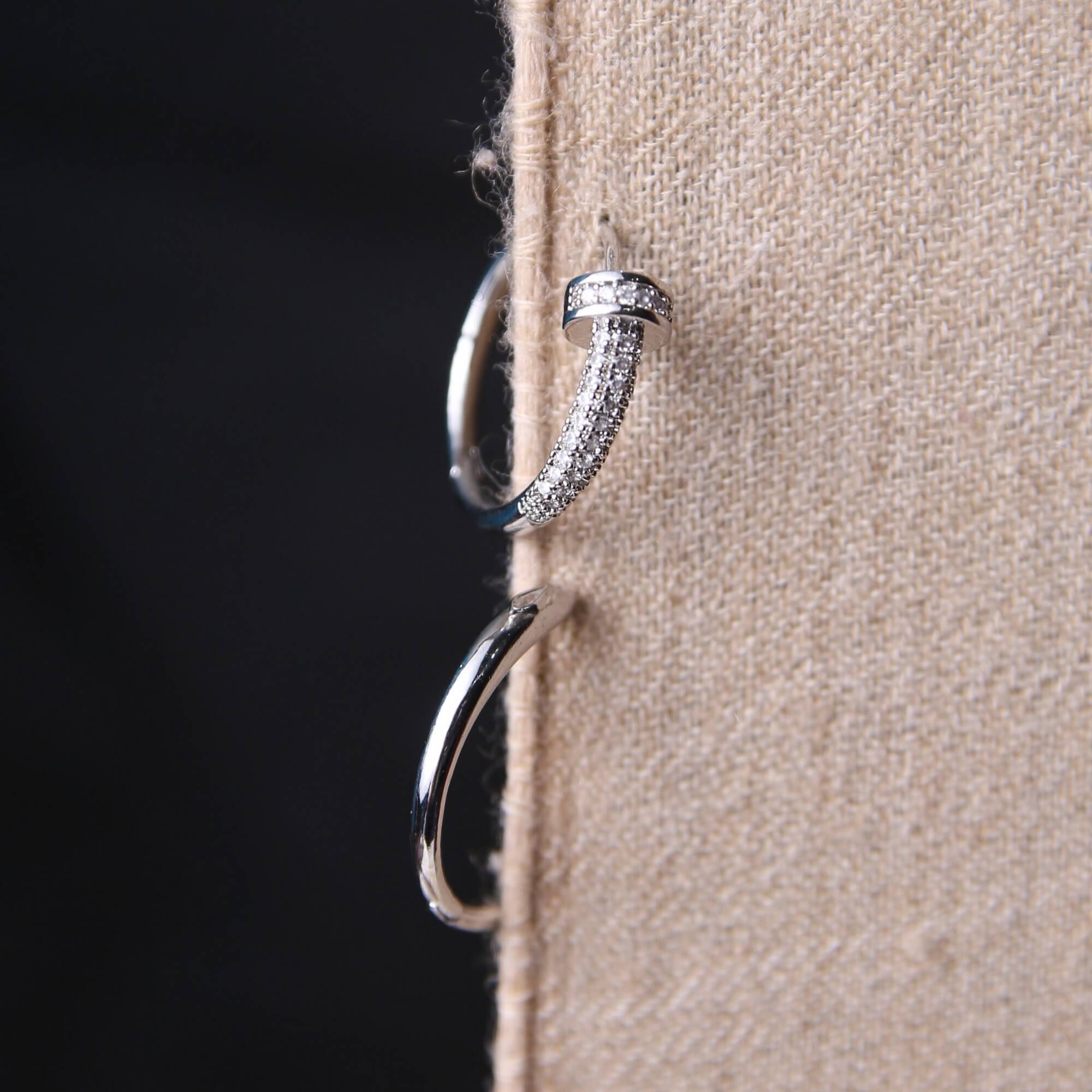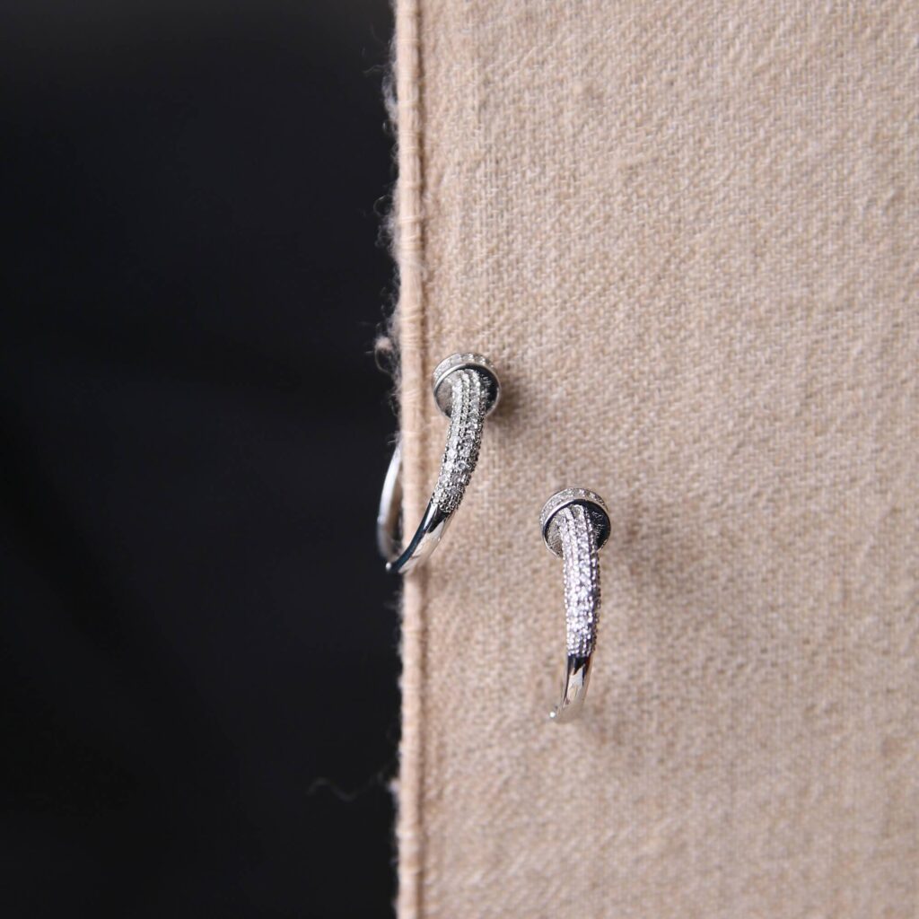 Make a bold, modern statement with these edgy and sophisticated nail hoop earrings. This contemporary design features a polished silver-tone finish shaped into a stylized nail that elegantly curves into a hoop silhouette. These are meticulously encrusted with shimmering pave-set zircon stones, adding a touch of high-fashion brilliance to the industrial-chic aesthetic. Perfect for those who love minimalist jewelry with a sharp, trendy twist, these earrings transition effortlessly from day to night.