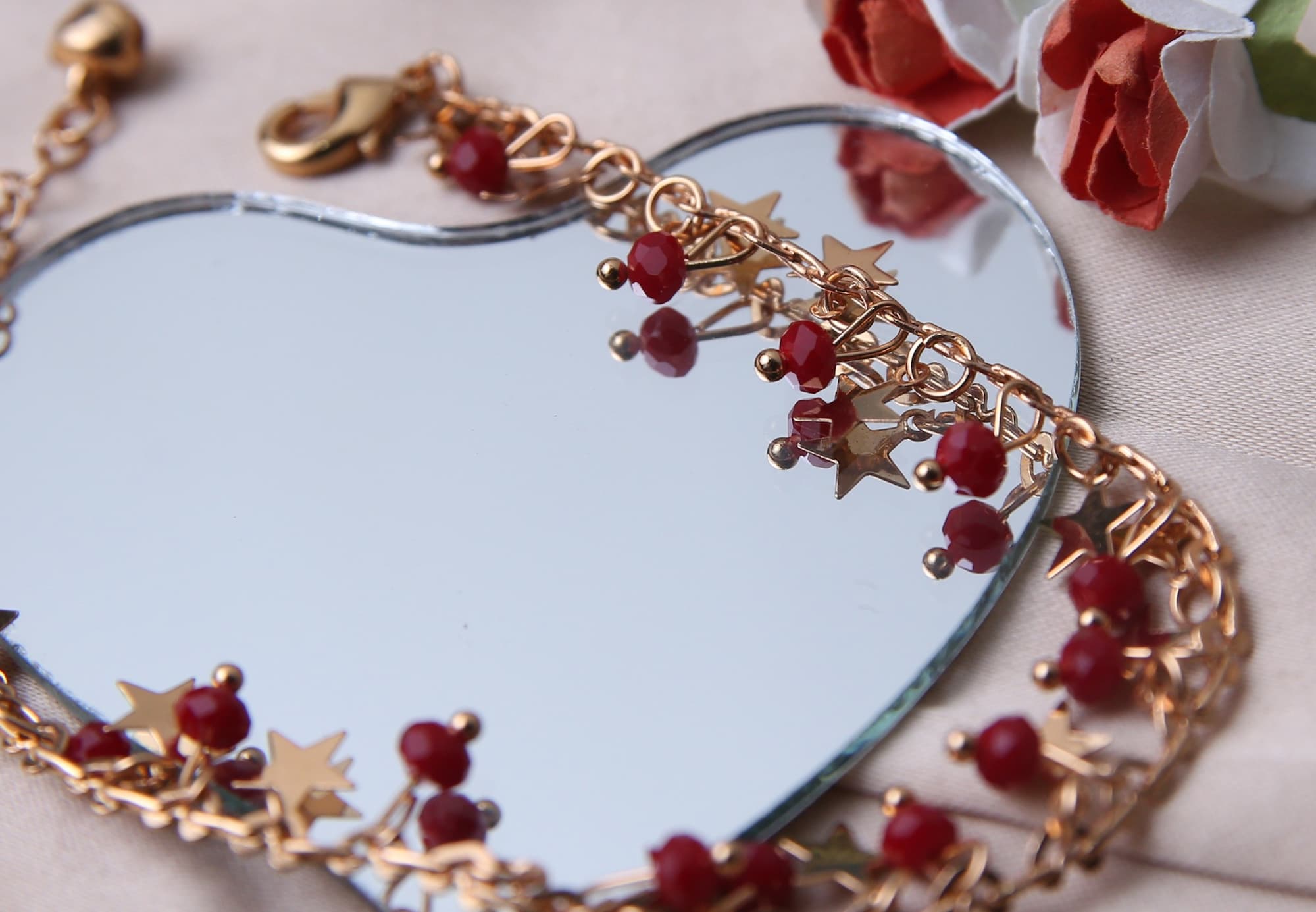 This delicate anklet bracelet features a gold-toned chain adorned with shimmering red beads and charming star-shaped charms. The design is both elegant and playful, making it a perfect accessory for any outfit.