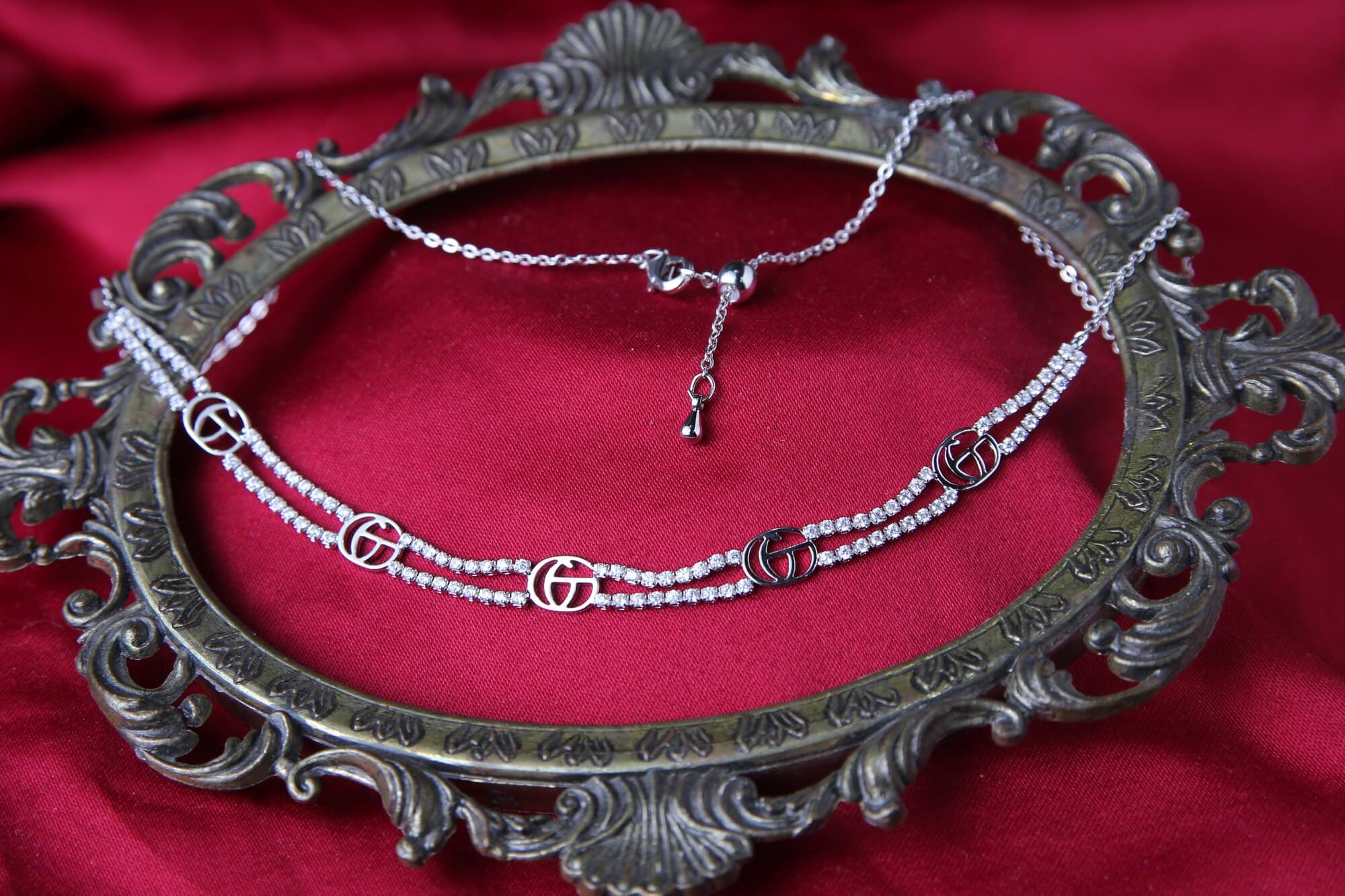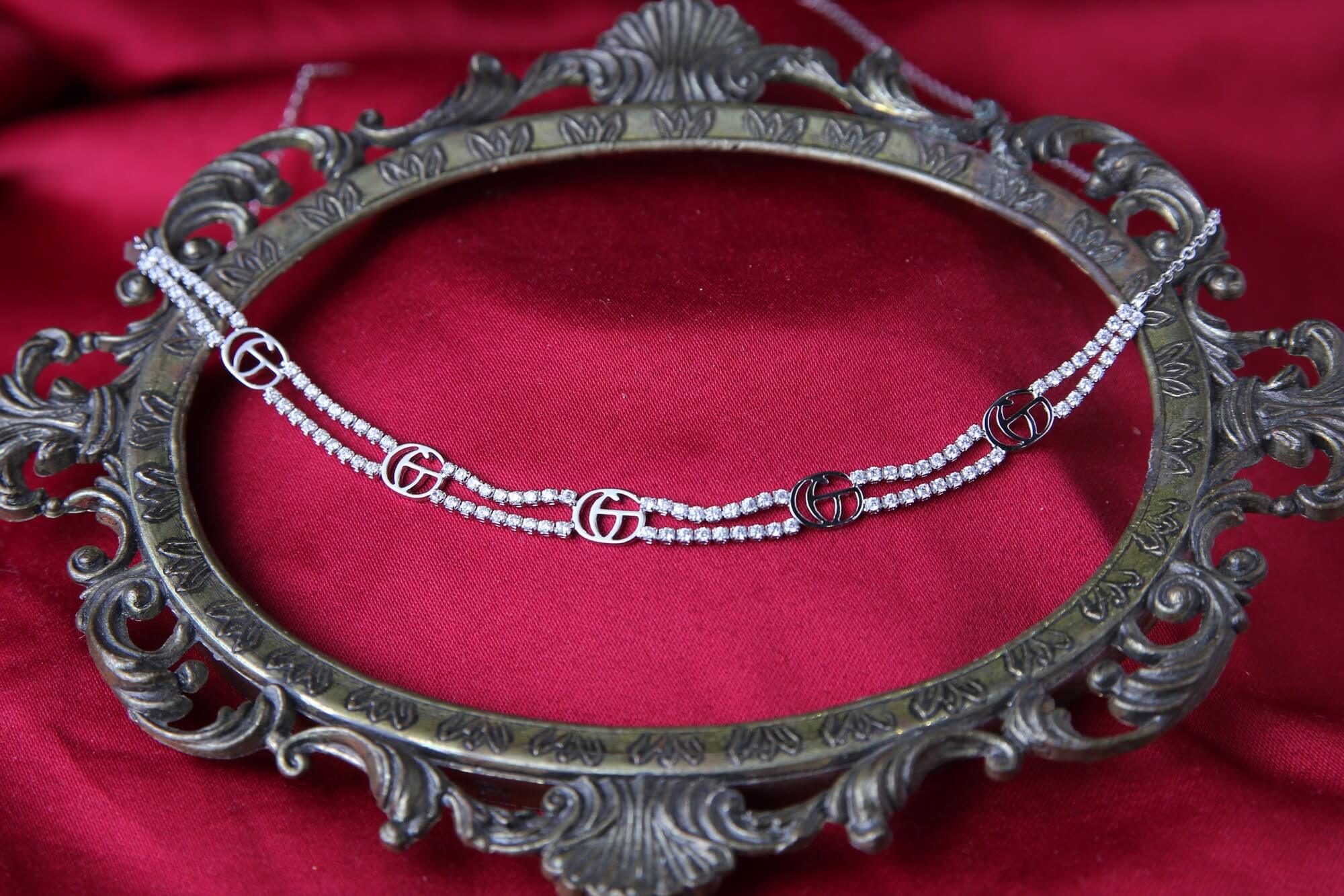 This modern and eye-catching layered necklace features a brilliant silver-tone finish and a distinctive logo-inspired design. The lower strand consists of two parallel rows of micro cubic zirconia stones for maximum sparkle. Interspersed along the strands are stylized, open double ‘G’ charms, adding a bold and contemporary statement to the piece. Secured with a lobster clasp and an adjustable extender chain, this necklace offers a glamorous and fashionable accessory perfect for making a statement.