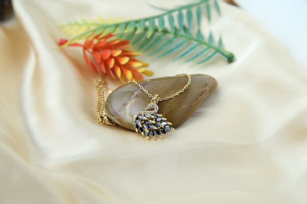 This sophisticated necklace has a striking black swan pendant hanging from a delicate gold chain. The sparkling black stones that are painstakingly sculpted into the swan’s body provide a striking contrast with the golden color. The pendant’s elegant resting place above a polished gray stone accentuates the piece’s overall refinement.
