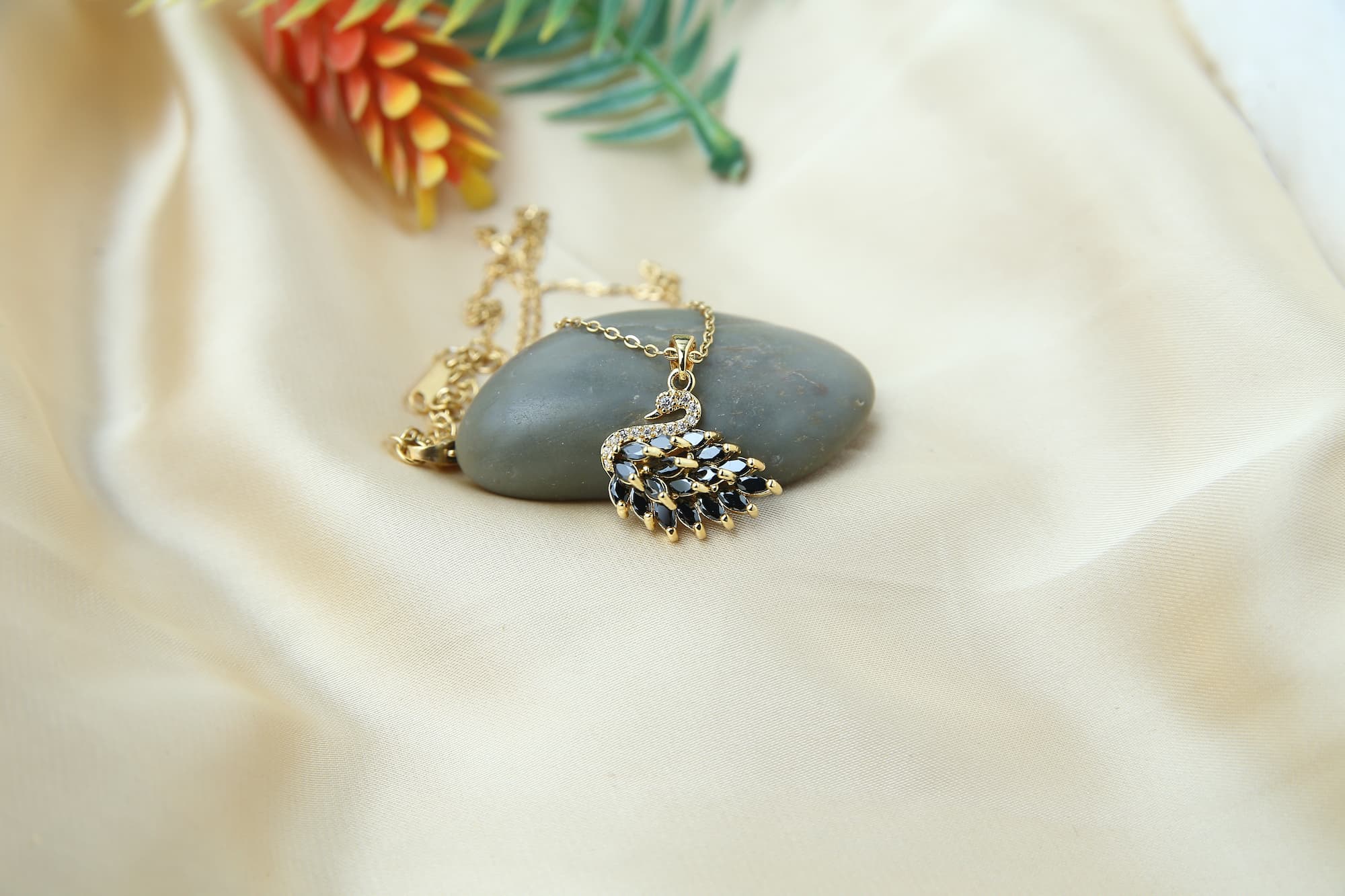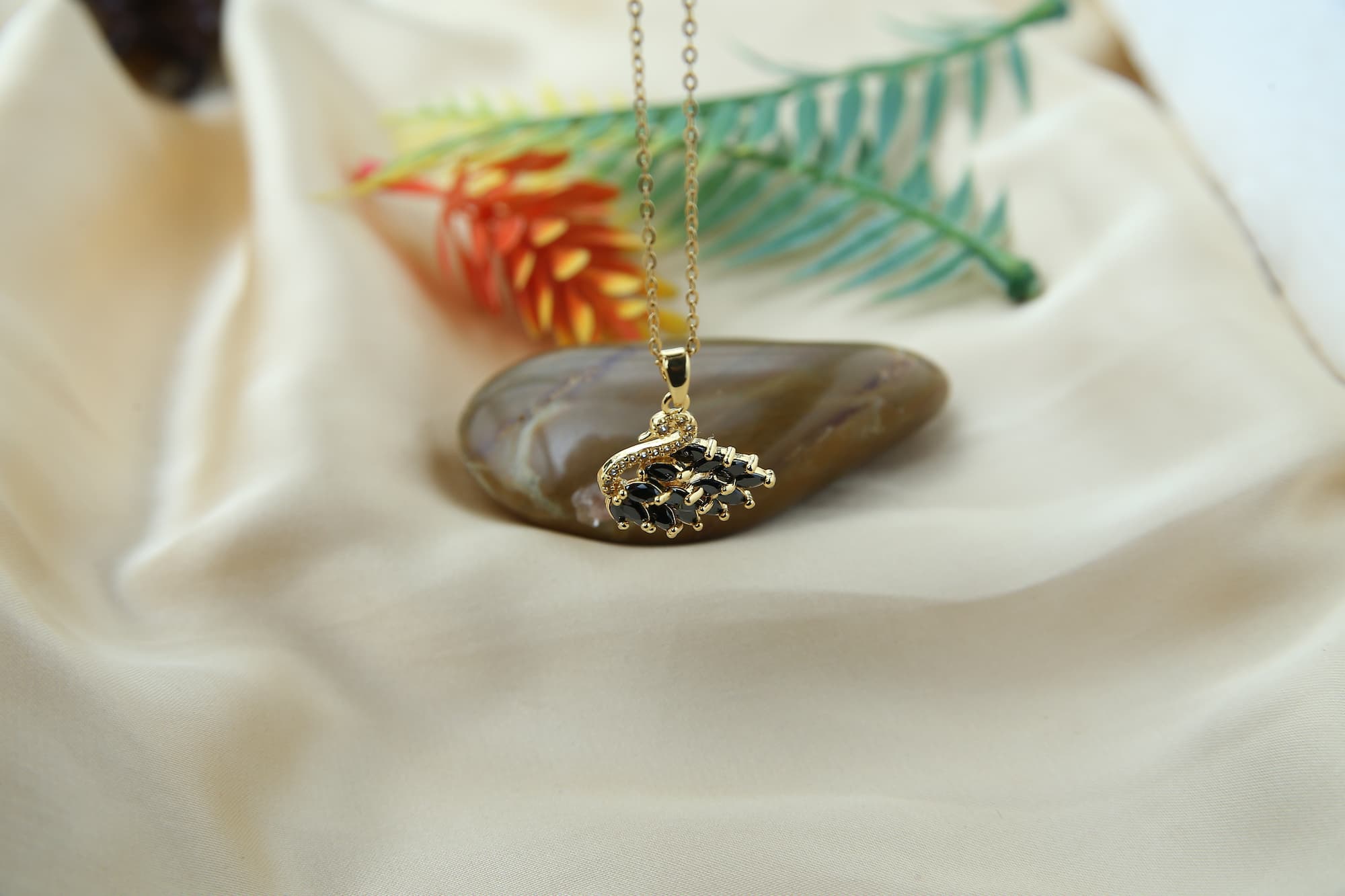 This sophisticated necklace has a striking black swan pendant hanging from a delicate gold chain. The sparkling black stones that are painstakingly sculpted into the swan’s body provide a striking contrast with the golden color. The pendant’s elegant resting place above a polished gray stone accentuates the piece’s overall refinement.