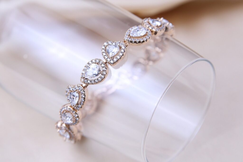 Add a romantic sparkle to your look with this stunning teardrop halo bracelet. Featuring pear-shaped center stones surrounded by a halo of fine crystals, this rose gold piece offers a graceful blend of elegance and brilliance. Ideal for weddings, parties, or gifting, this bracelet is where timeless design meets modern charm.