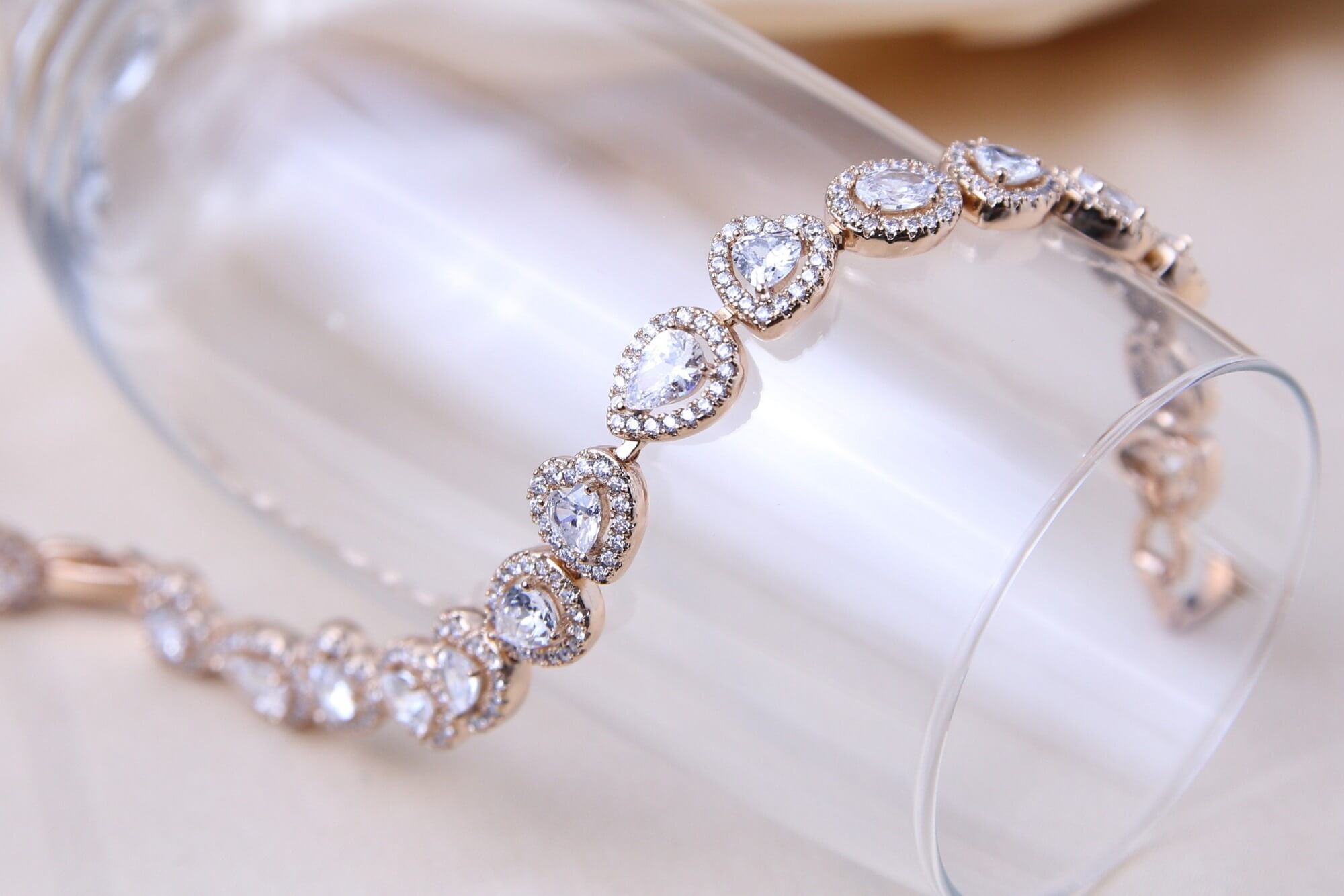 Add a romantic sparkle to your look with this stunning teardrop halo bracelet. Featuring pear-shaped center stones surrounded by a halo of fine crystals, this rose gold piece offers a graceful blend of elegance and brilliance. Ideal for weddings, parties, or gifting, this bracelet is where timeless design meets modern charm.