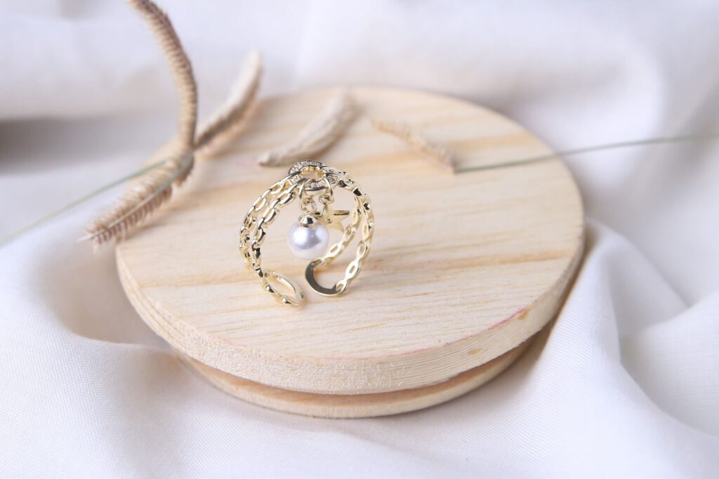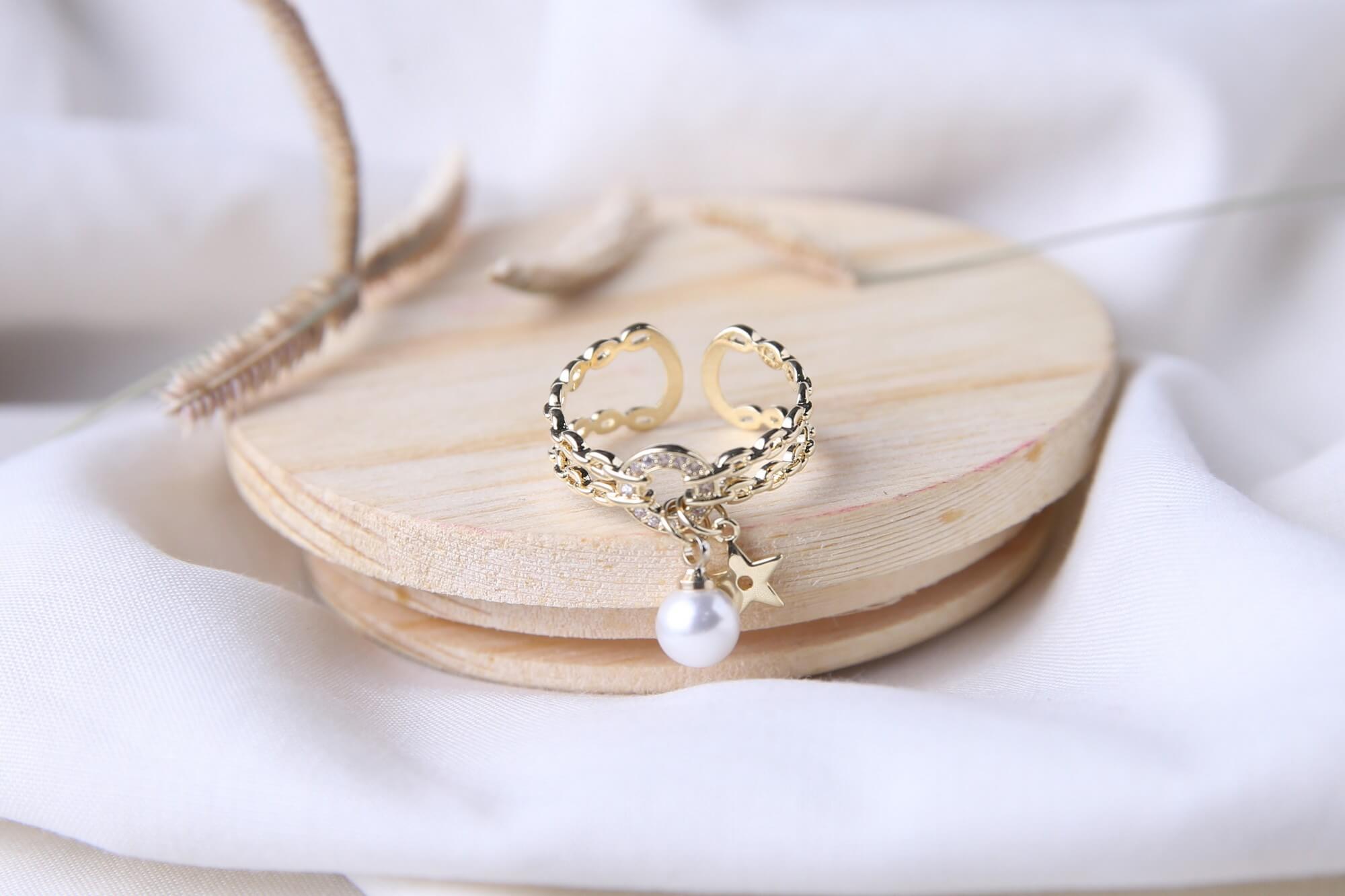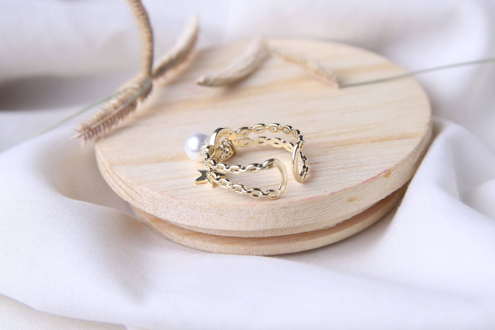 Embrace a touch of whimsical elegance with this radiant gold-toned open ring. The design features a delicate, double-banded filigree construction with an intricate scalloped texture that encircles the finger. At the center sits a shimmering crystal-encrusted halo, from which dangles a high-luster, creamy white teardrop pearl and a polished gold-toned star. The open-back design allows for an adjustable, custom fit, making it a versatile statement piece for any finger. Whether worn as a standalone focal point or paired with other celestial accessories, this ring offers a fluid, playful movement that captures the light and adds a dreamy, sophisticated finish to your ensemble.