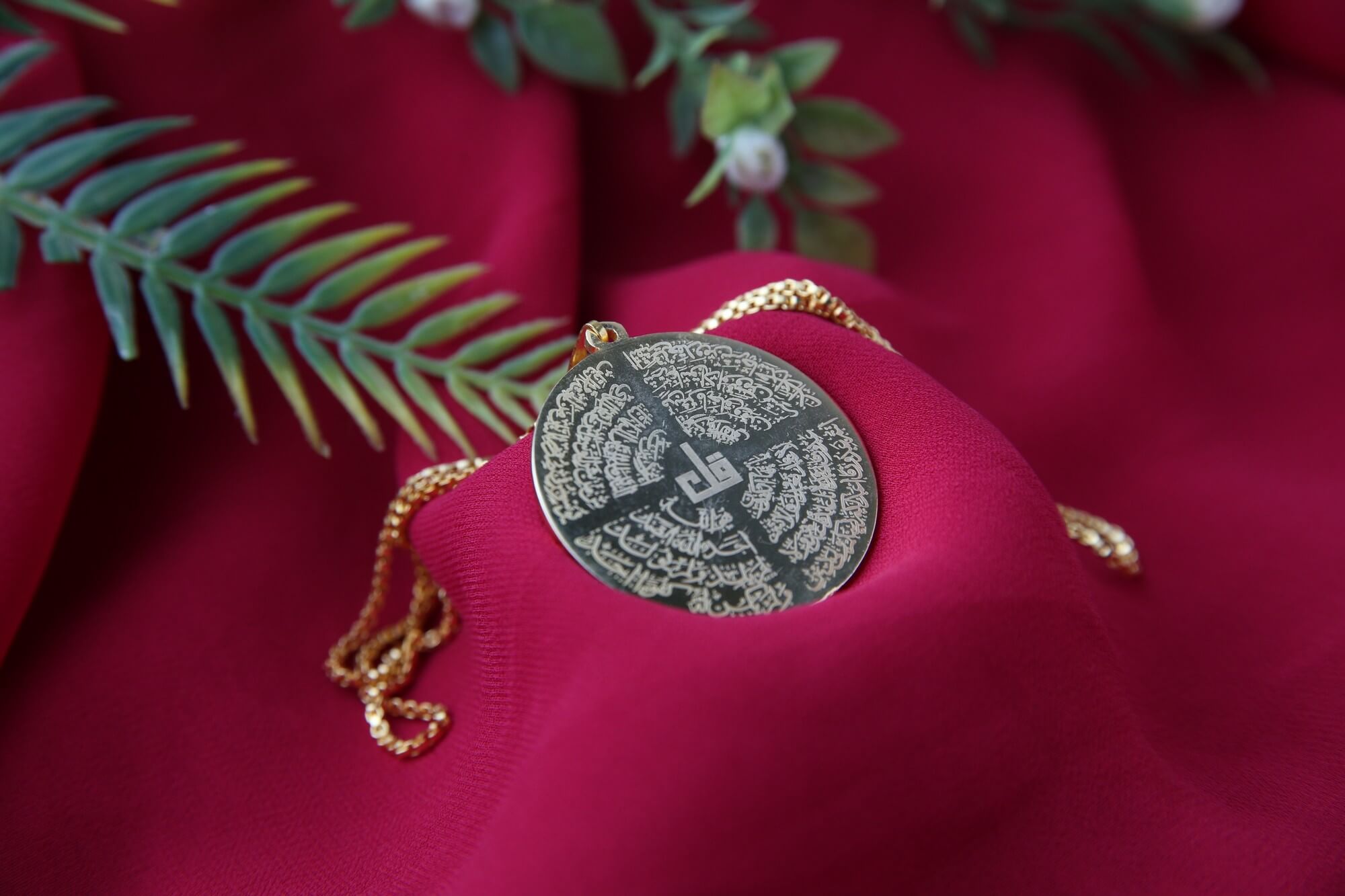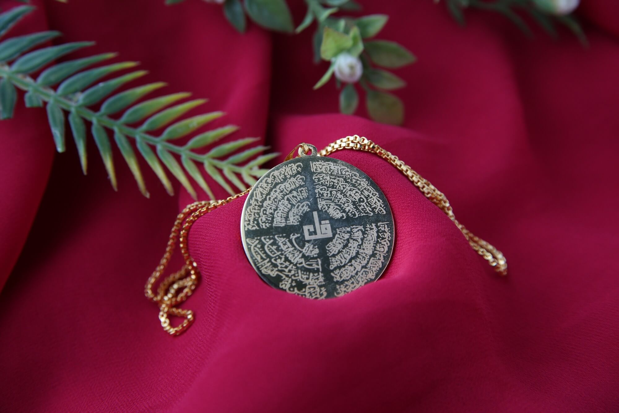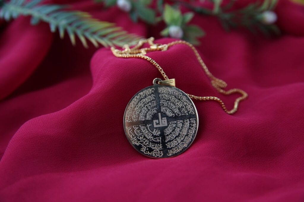 Carry a beautiful reminder of faith with The Four Qul Islamic Pendant. This elegant pendant features a circular medallion inscribed with the four Quls, powerful surahs from the Holy Quran. The intricate calligraphy is etched against a background color backdrop, creating a striking visual contrast. Suspended from a delicate gold chain, this pendant is a cherished piece of spiritual jewelry, offering both beauty and blessings.