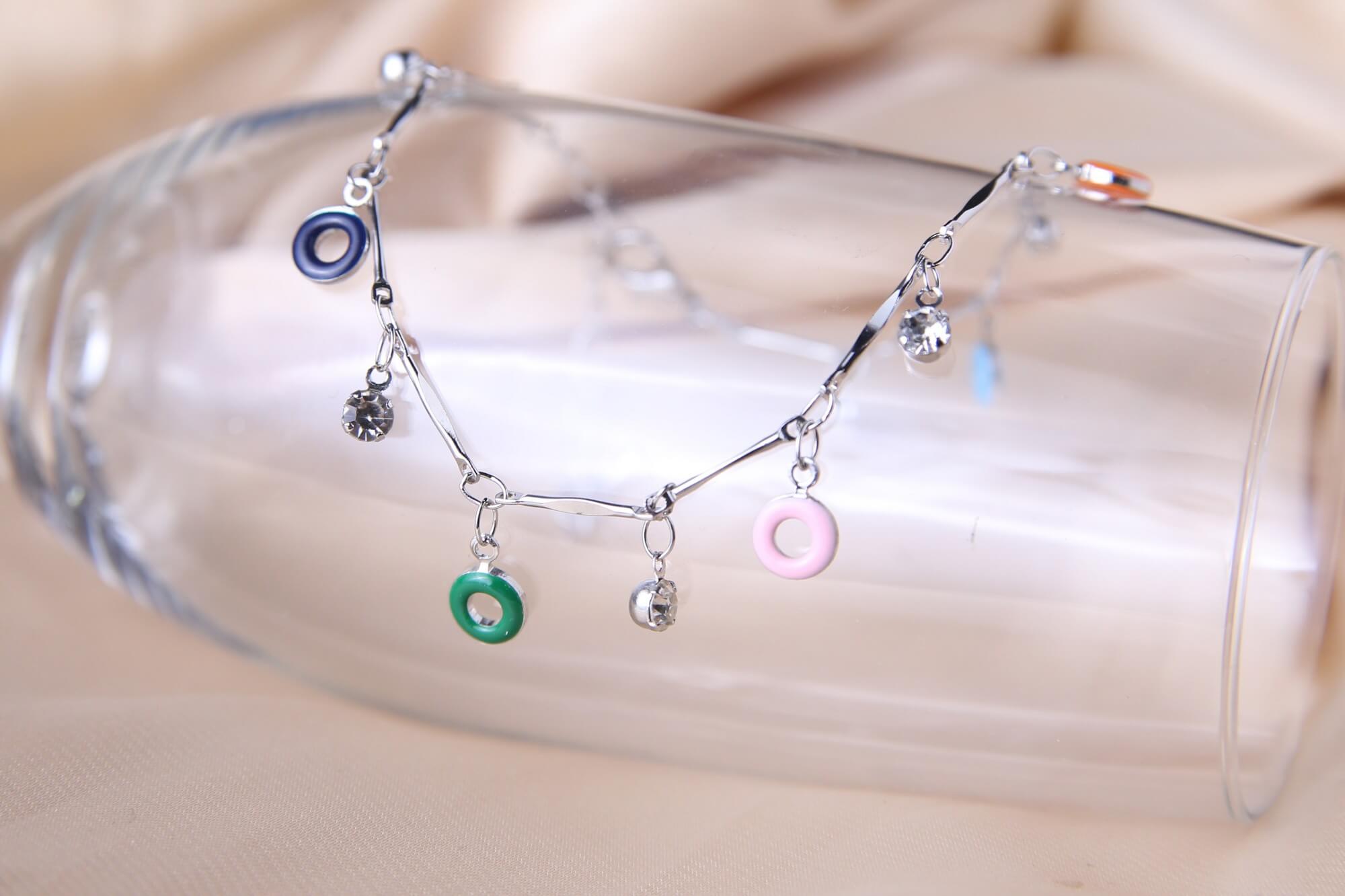 Bring a touch of modern artistry to your style with this chic silver-toned geometric anklet. The design features a contemporary bar-and-link chain that provides a sleek, structured silhouette, beautifully accented by alternating charms. High-shine crystal studs are paired with vibrant, colorful enamel rings in a palette of navy blue, forest green, soft pink, and bright orange, creating a playful yet sophisticated contrast. This piece perfectly bridges the gap between minimalist jewelry and bold, eclectic fashion, making it a versatile addition to any wardrobe. Whether you are dressing up for a social gathering or adding a pop of color to your everyday casual look, its unique combination of sparkling textures and colorful accents ensures a radiant finish to your ensemble.