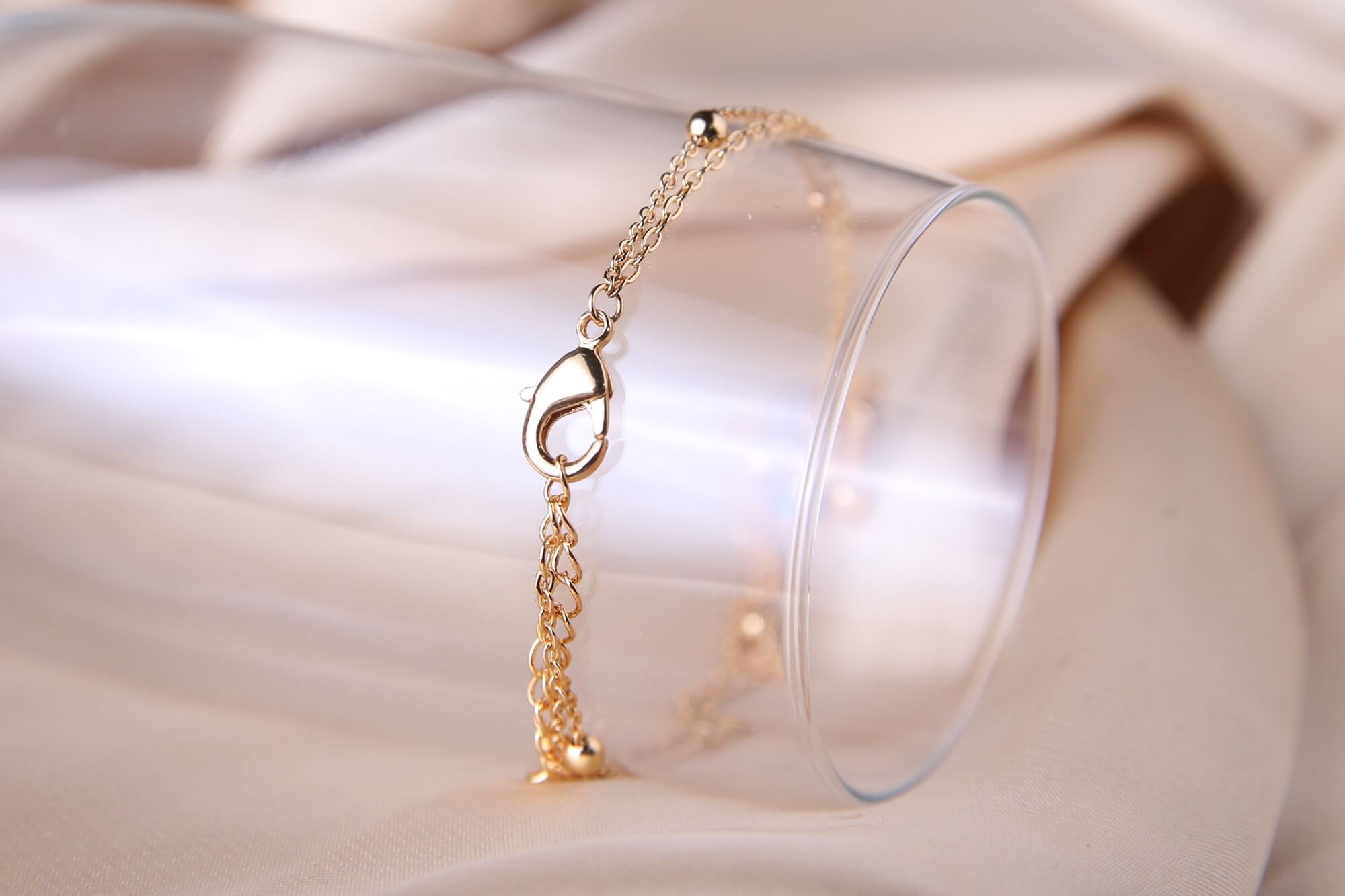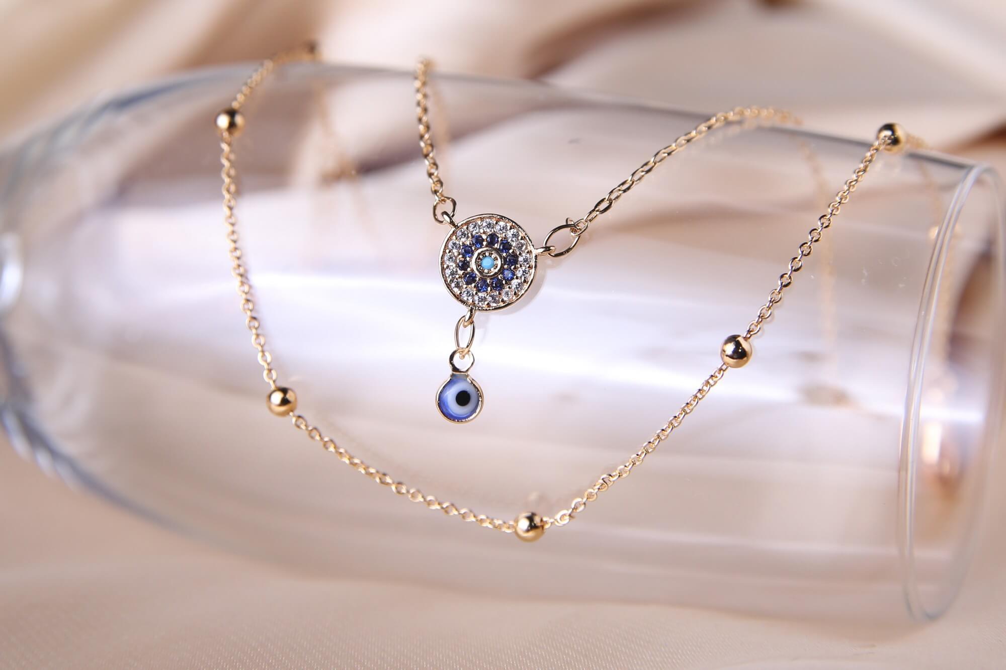Embrace both style and protection with this exquisite gold-toned layered anklet. This piece features a sophisticated dual-chain design, a delicate outer station chain adorned with polished gold beads and an inner chain showcasing a brilliant, crystal-encrusted medallion. The central charm is meticulously detailed with shimmering white and sapphire-blue stones. Perfect for those who appreciate meaningful jewelry with a bohemian flair, this anklet adds a protective shimmer to your look, whether you’re strolling along the beach or dressing up for a night out. Its radiant gold finish and intricate symbolism make it a timeless accessory that carries a touch of ancient tradition into modern fashion.