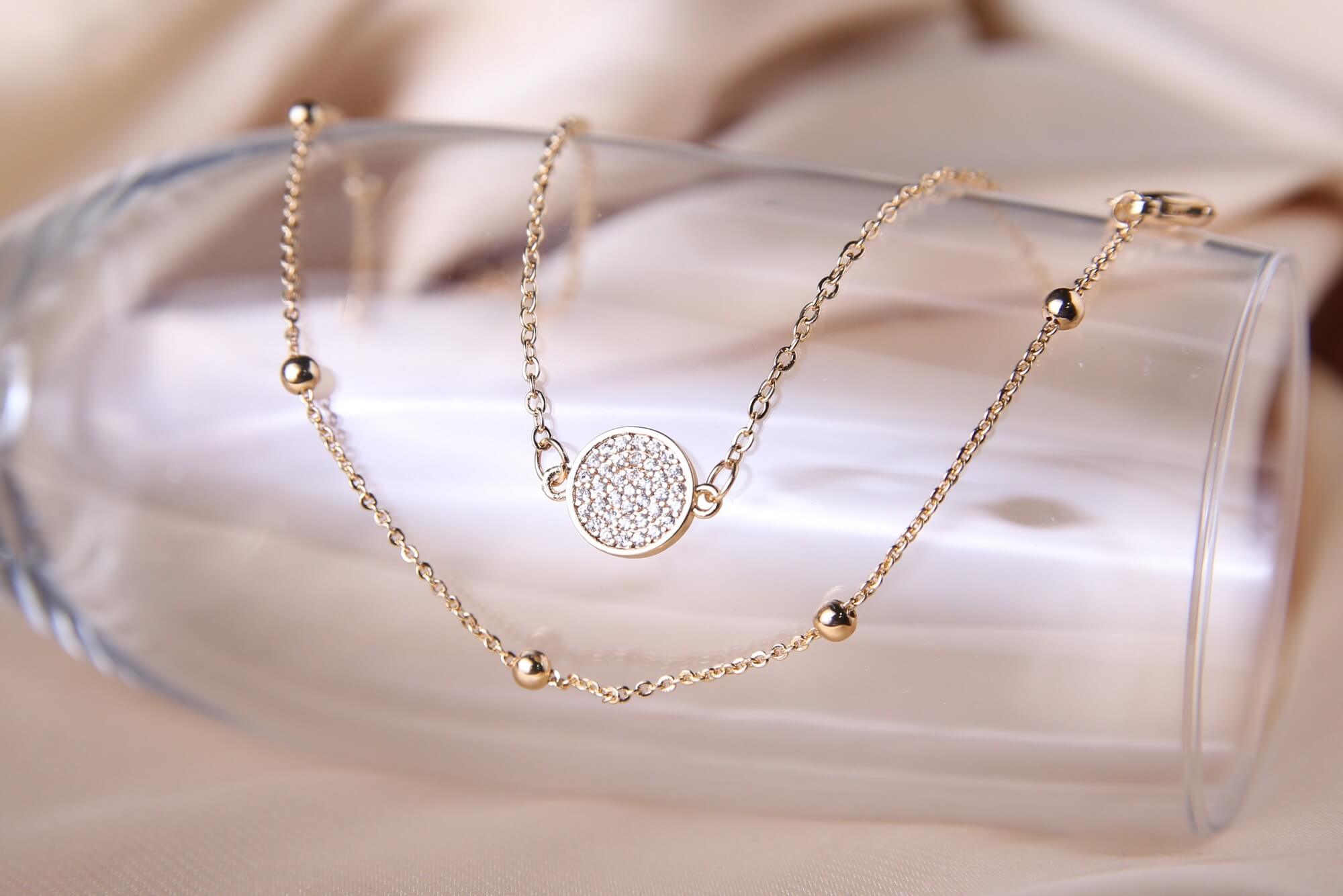 Elevate your jewelry collection with this sophisticated and brilliantly designed layered anklet. Featuring a dual-chain silhouette, this piece combines a classic gold-toned station chain accented with polished spherical beads and a shorter, delicate chain centered with a pave-set disc. The focal medallion is densely encrusted with shimmering clear crystals that catch and reflect light with every movement, creating a luxurious diamond-dusted effect. This anklet perfectly balances modern minimalism with high-fashion glamour, making it a versatile accessory for both daytime elegance and evening sparkle. Whether worn as a solo statement or paired with other dainty gold pieces, its radiant finish and intricate detailing ensure a refined touch to any look.