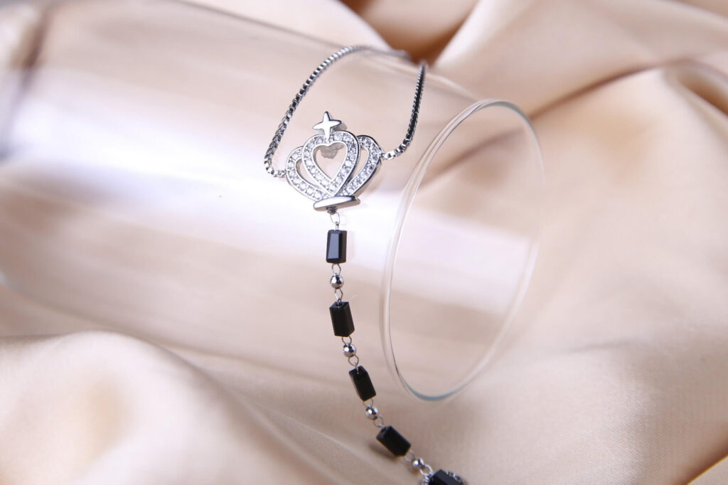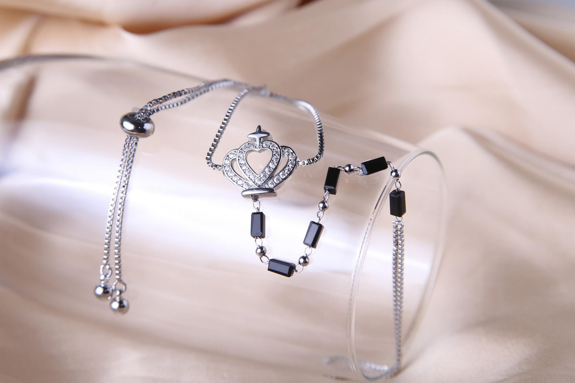 Command attention with this exquisite silver-toned crown heart bracelet, a piece that perfectly marries regal symbolism with modern jewelry design. The focal point features a stunning openwork crown charm, intricately pavé-set with shimmering crystals that surround a central heart-shaped silhouette. This majestic centerpiece is flanked by a unique combination of sleek, rectangular black onyx-style beads and polished silver spacers, creating a bold, high-contrast aesthetic.The standout feature of this piece is the seamless integration of a delicate ring chain that extends from the central crown heart charm to a matching silver-toned loop designed to be worn on the finger. This design not only adds a touch of royal flair but also ensures that the intricate crown centerpiece remains perfectly positioned and showcased with every gesture you make.