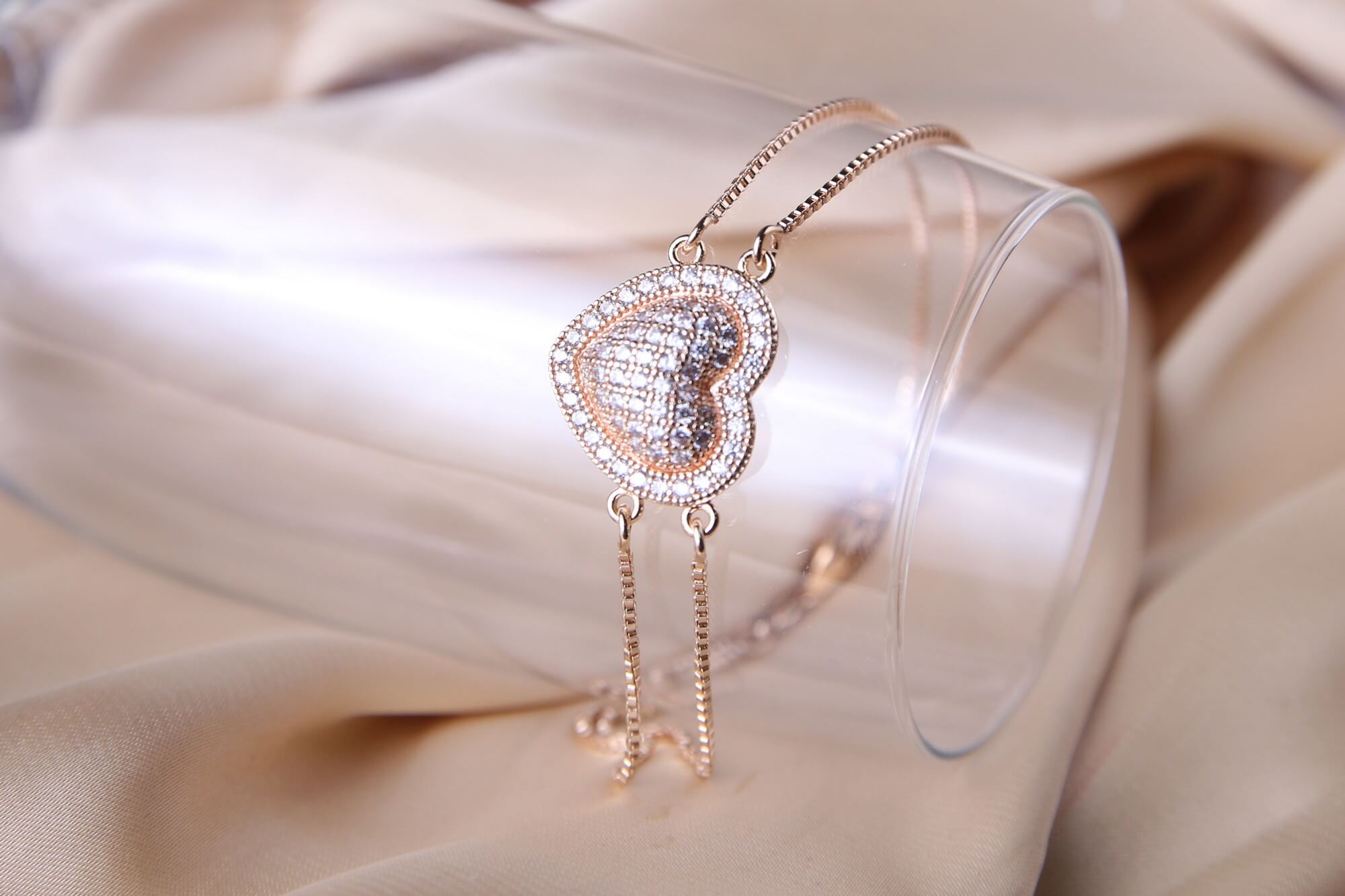 Radiate love and light with this breathtaking rose-gold-toned slider bracelet, a perfect blend of romantic symbolism and contemporary glamor. The centerpiece features a stunning, dimensional heart charm entirely pavé-set with brilliant-cut crystals that catch the light from every angle. This dazzling heart is framed by a delicate crystal halo, creating a layered, double-radiance effect that serves as a bold focal point. The charm is suspended on a dual-strand box chain, which not only provides extra durability but also adds a modern, textured aesthetic to the wrist. Designed with an adjustable slider mechanism, this piece offers a tailored, comfortable fit for all wrist sizes, making it an ideal gift for a loved one or a luxurious treat for yourself.