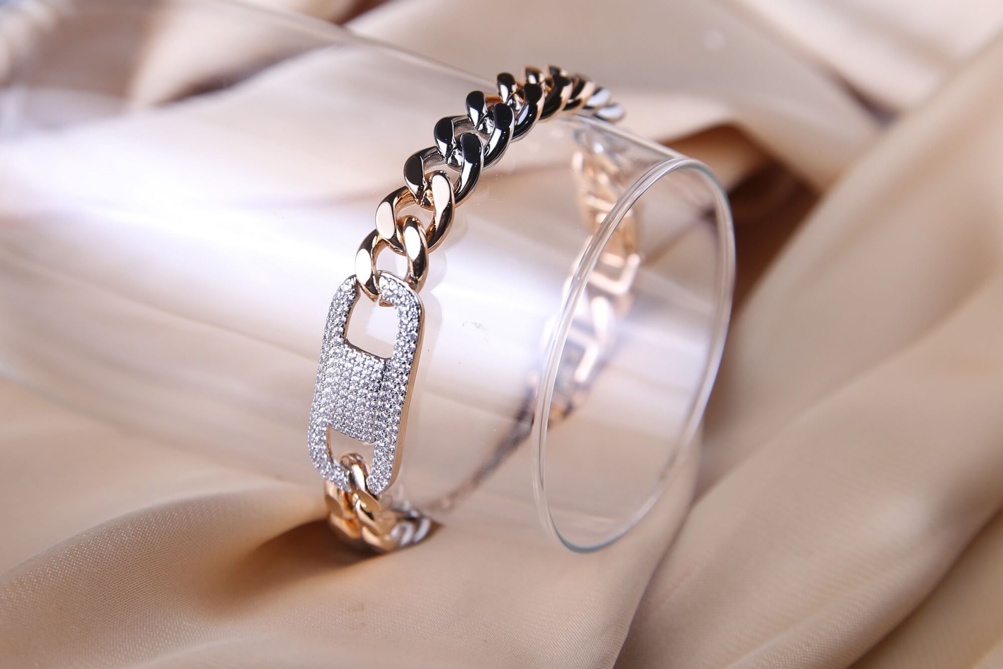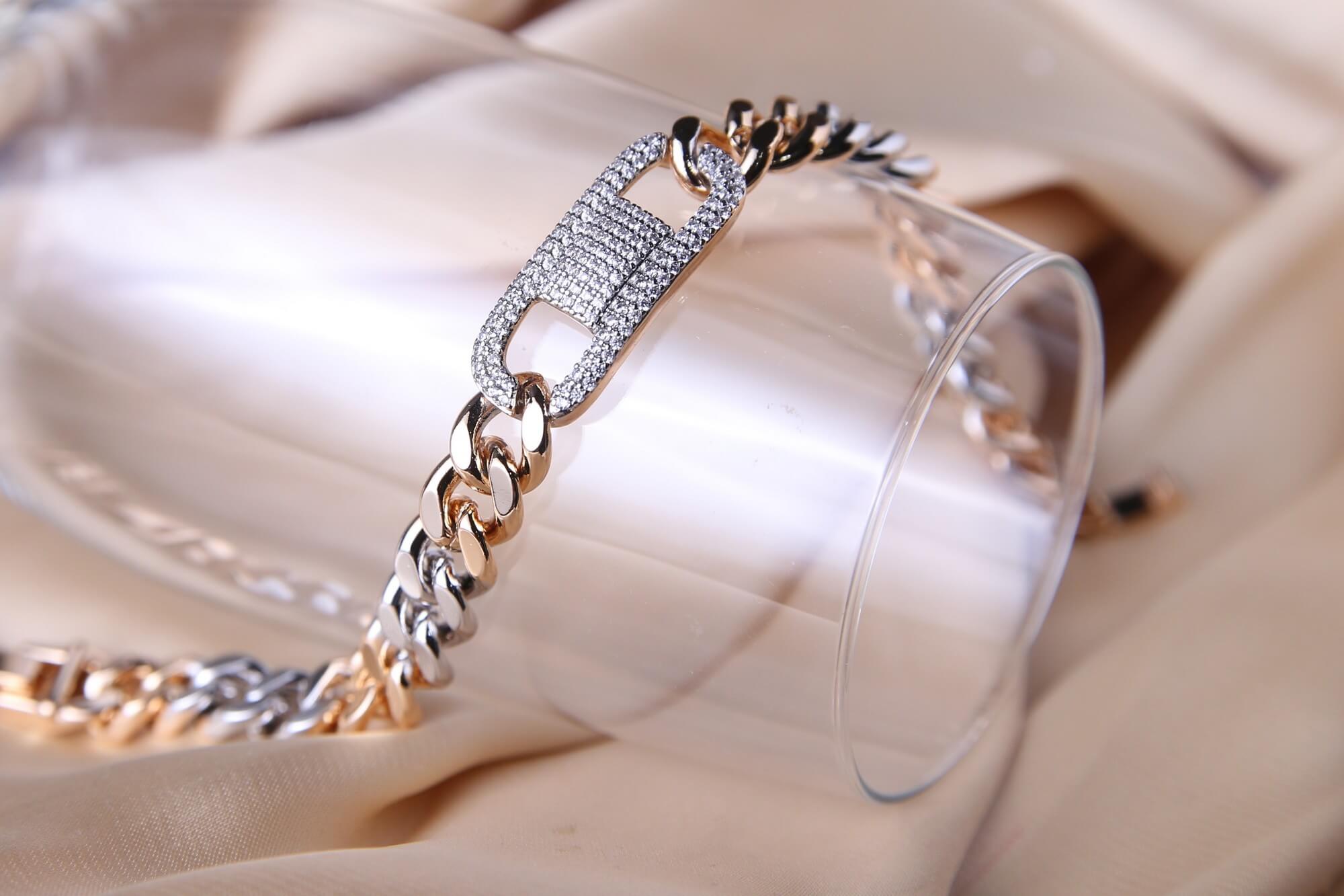 Infuse your style with a bold, contemporary edge with this striking mixed-metal curb chain bracelet. The design features a heavy-gauge, high-polish link chain that artfully transitions between radiant gold and cool silver tones, offering a versatile aesthetic that complements any jewelry collection. The centerpiece is a magnificent, oversized rectangular link, densely pave-set with shimmering crystals that create a brilliant, diamond-like surface. This industrial-chic focal point adds a touch of high-fashion luxury to the rugged curb chain silhouette. Finished with a secure, integrated fold-over clasp, this bracelet is the perfect statement piece for those who want to bridge the gap between street-style cool and red-carpet elegance.
