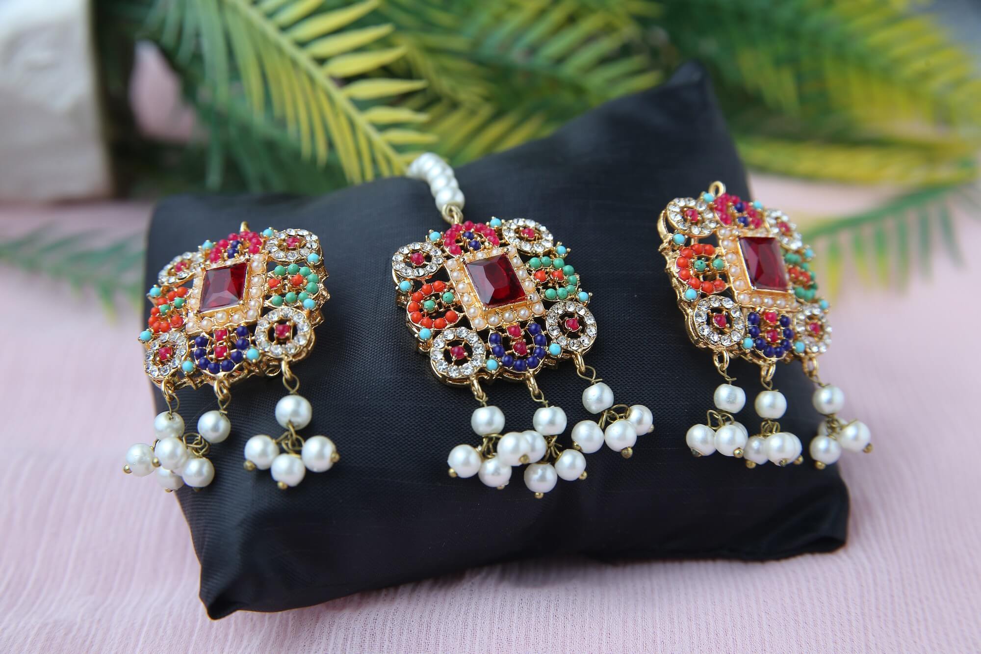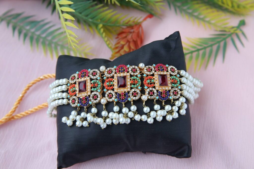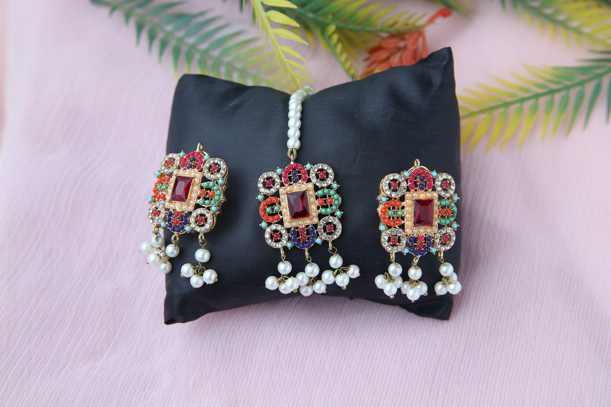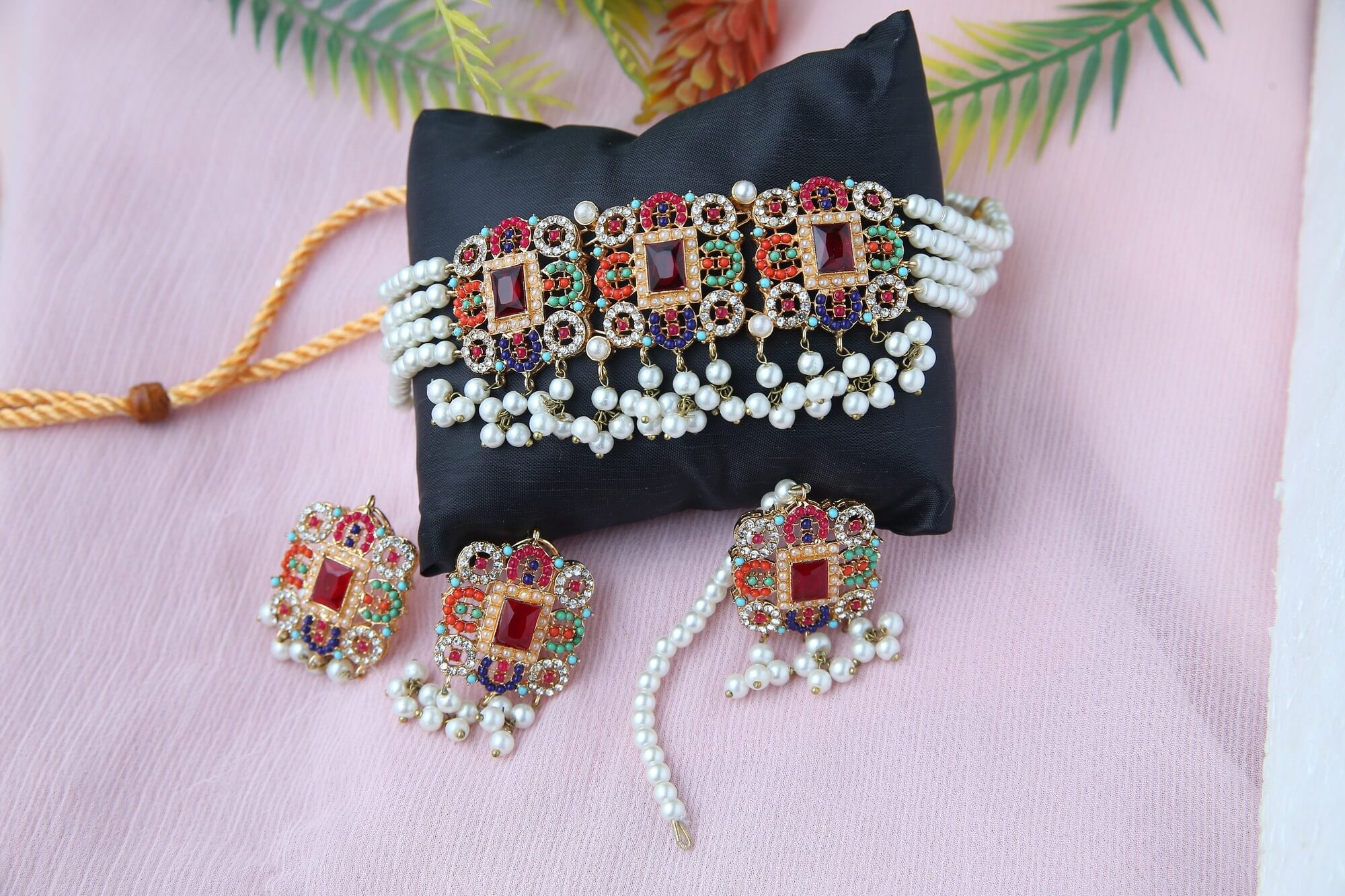 This magnificent traditional jewelry set has an elegant combination of pearls and multi-colored stones, making it ideal for special occasions or weddings. The outfit contains a choker necklace, earrings, and a tika. Each item is elaborately created with a square ruby-like stone in the middle, surrounded by brilliant gemstones in green, red, and purple, giving it a regal appearance.