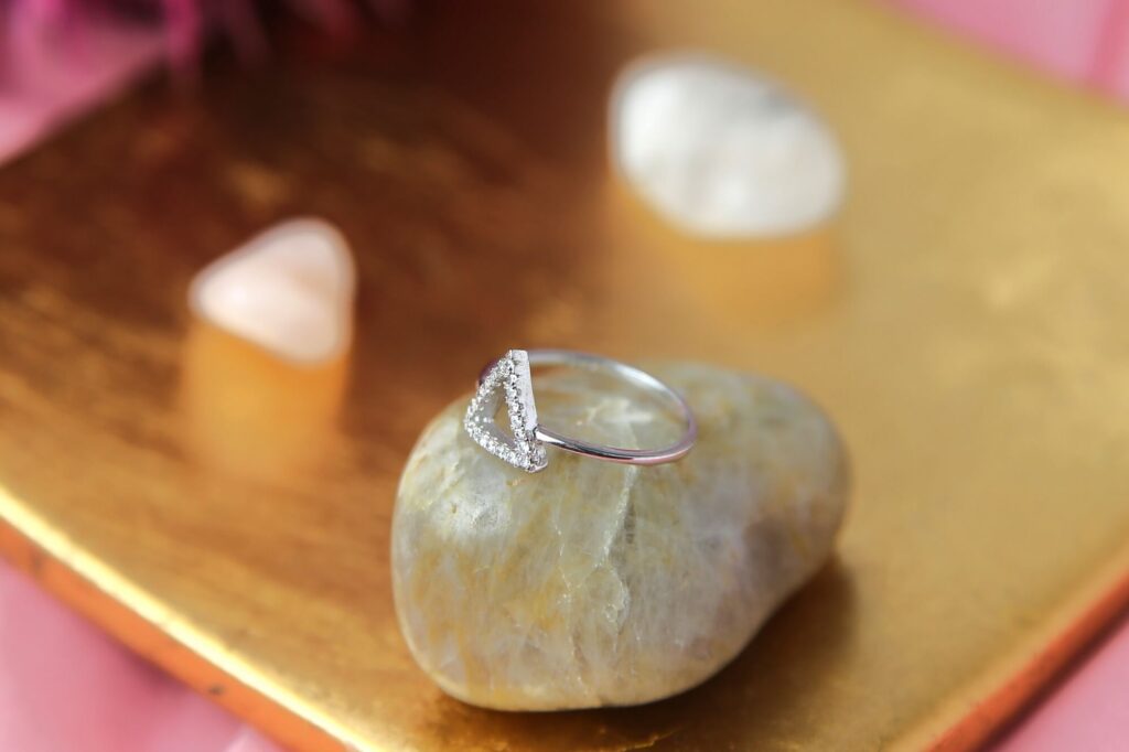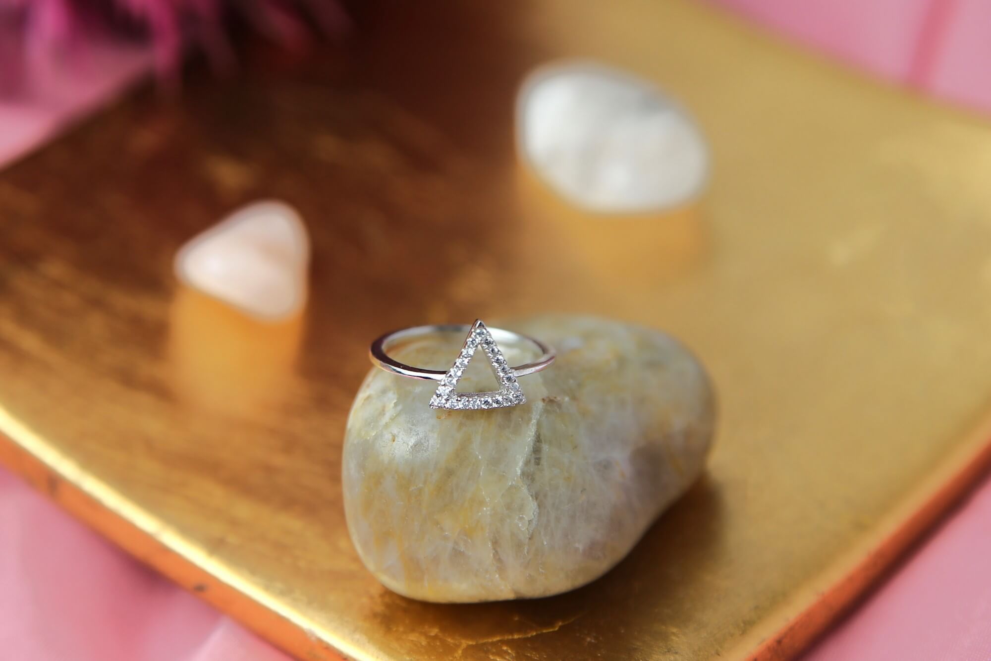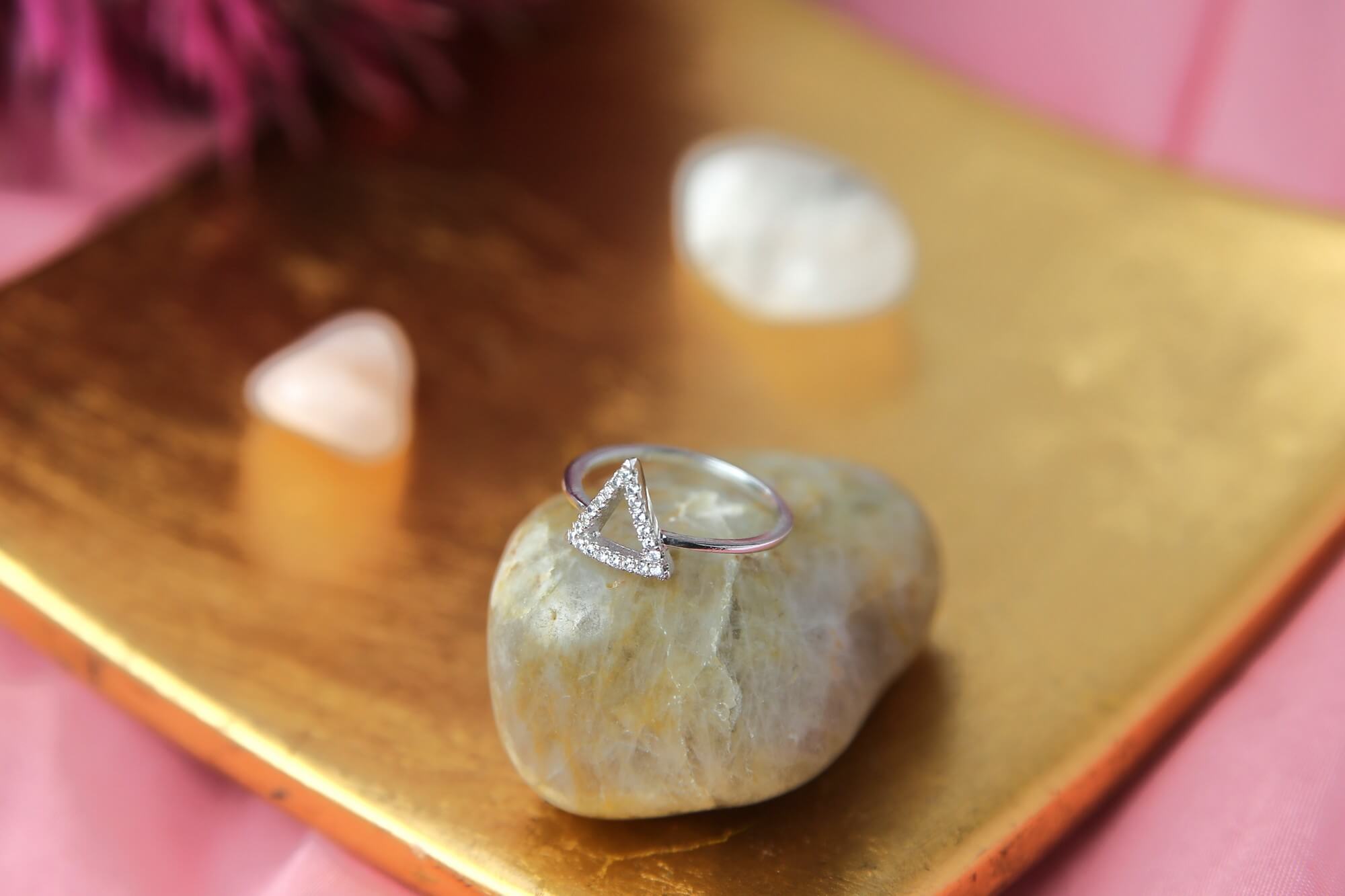 A pretty ring made of sterling silver with a triangular pattern adorned with glittering zirconia stones. The ring radiates elegance and contemporary beauty against a tranquil background of natural stones and delicate pink hues.