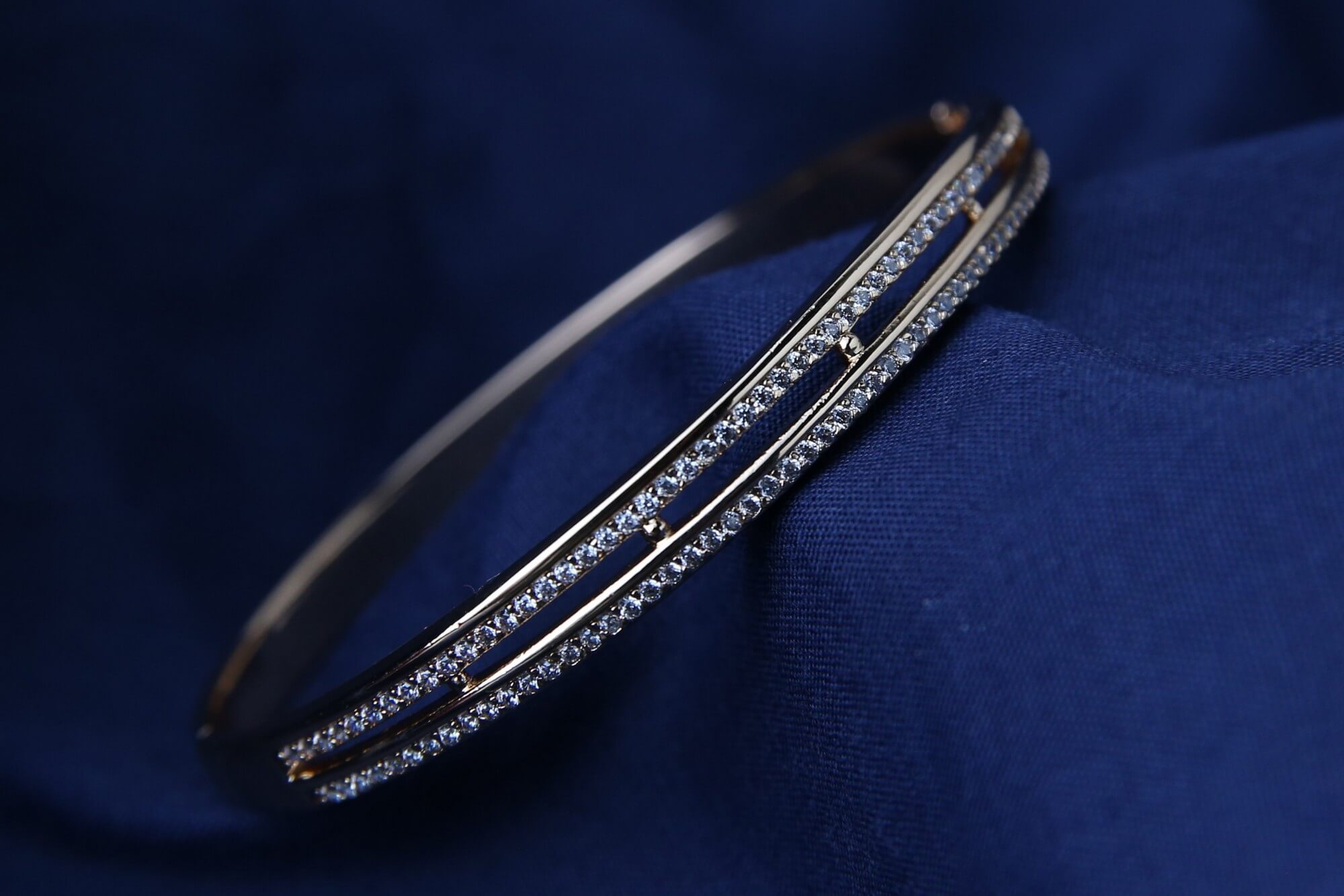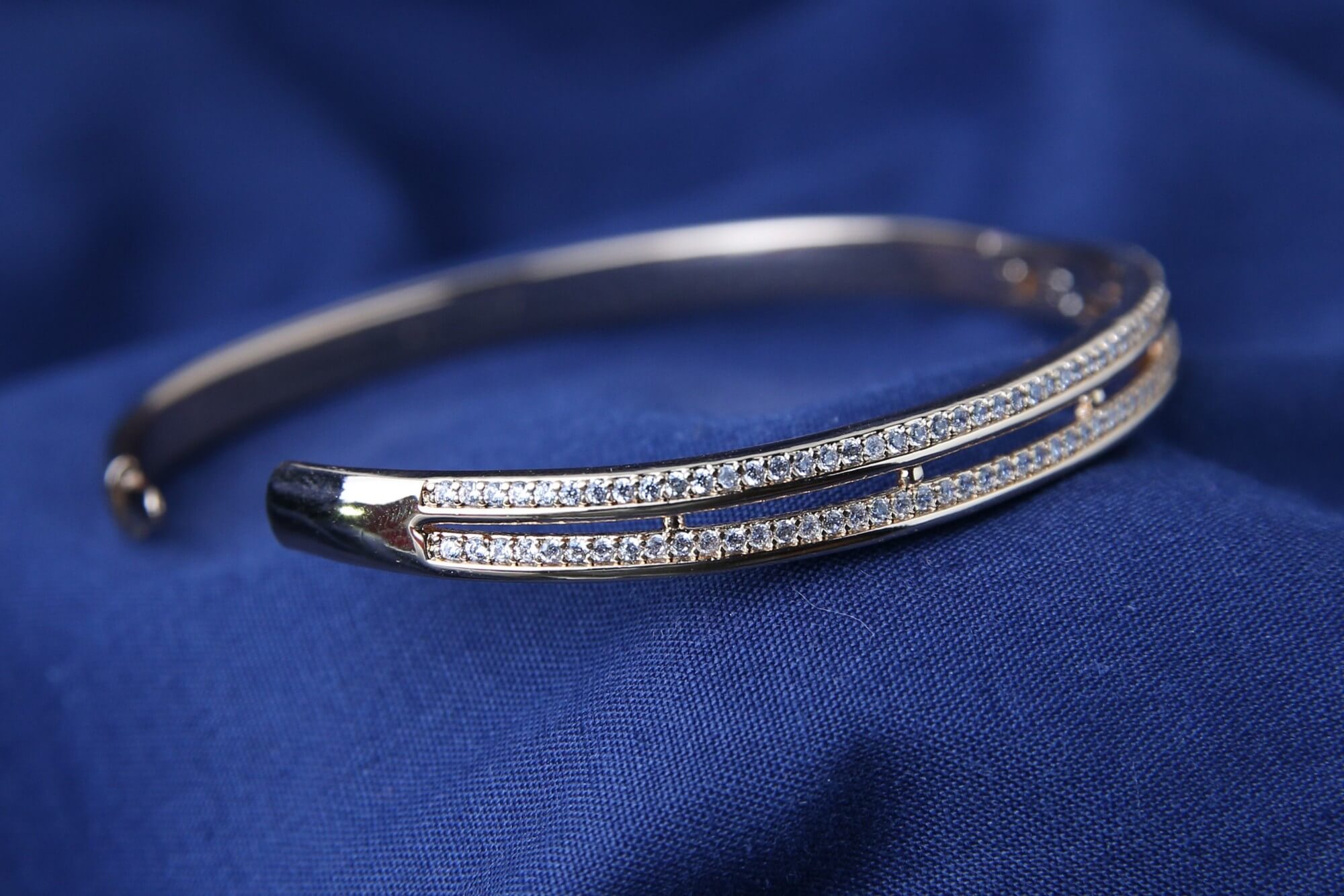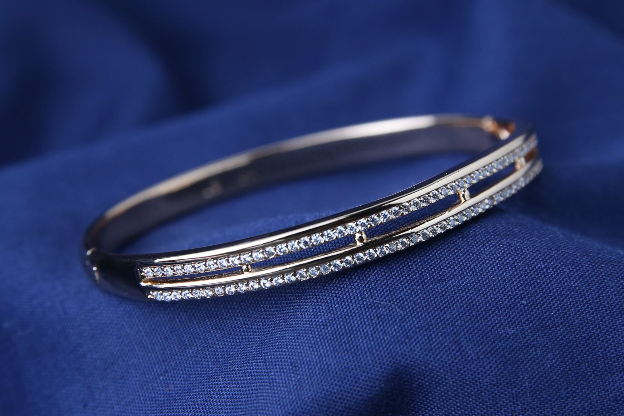 Elevate your wrist with the dazzling Triple Radiance Bangle. This stunning item blends a striking shimmer with sleek, contemporary designs. It has three glistening bands with carefully placed stones on each, creating an elegant and unquestionably glitzy appearance. Ideal for making a statement at your upcoming special event or adding a little luxury to your regular wardrobe. Crafted from durable, polished metal for a long-lasting luster and comfortable wear.