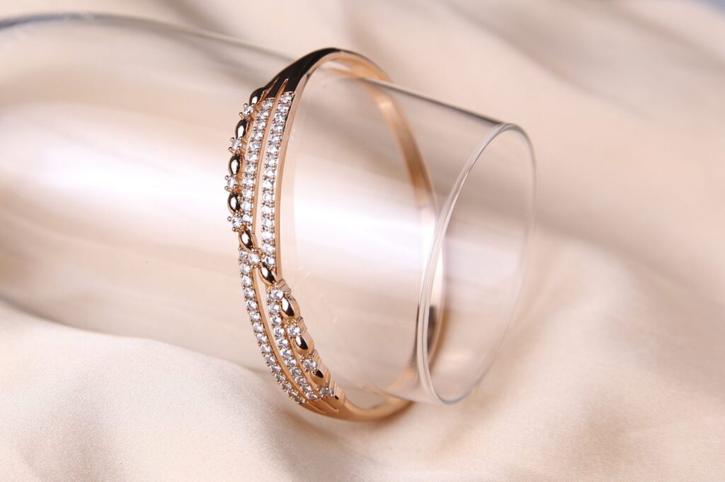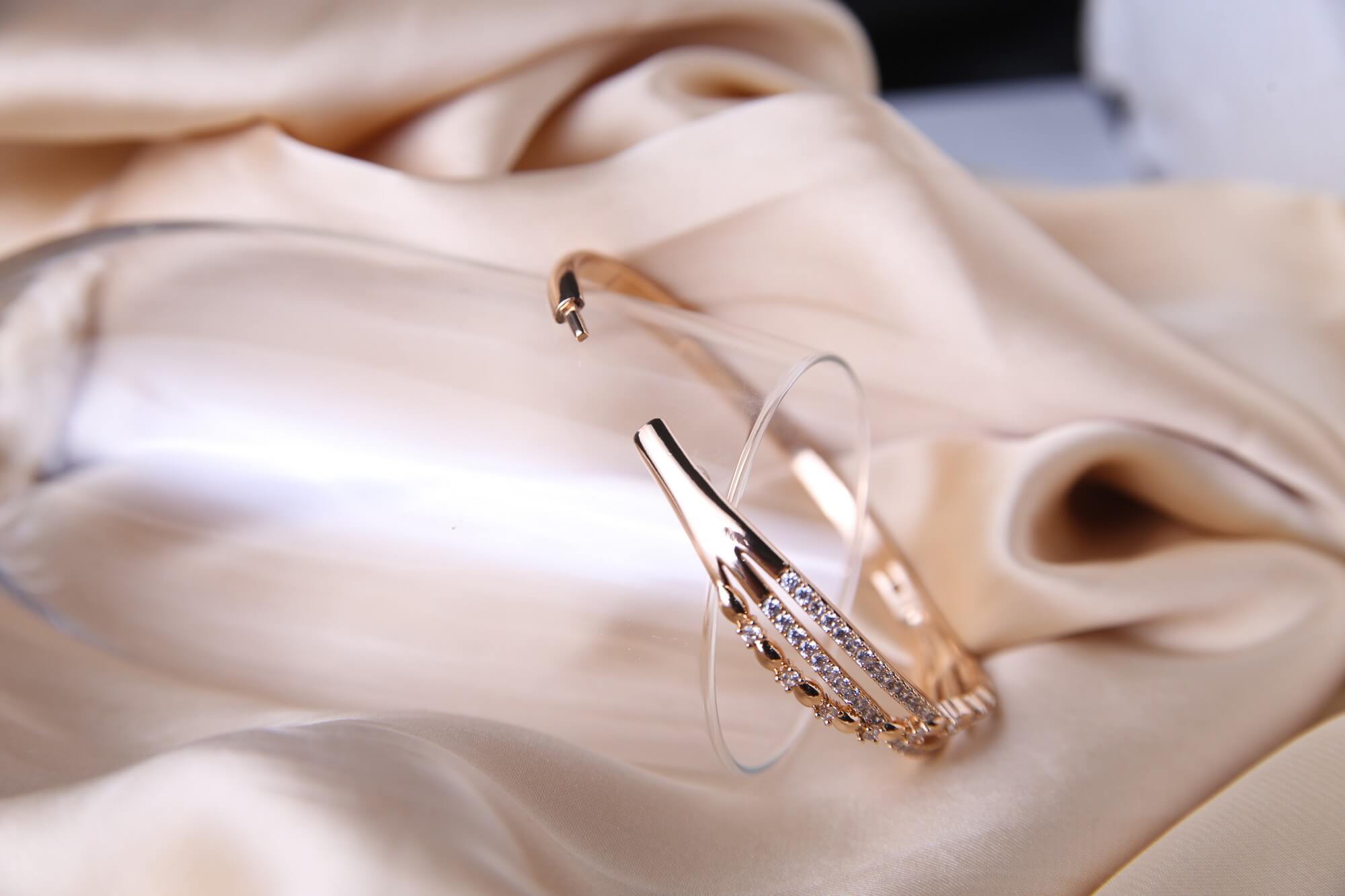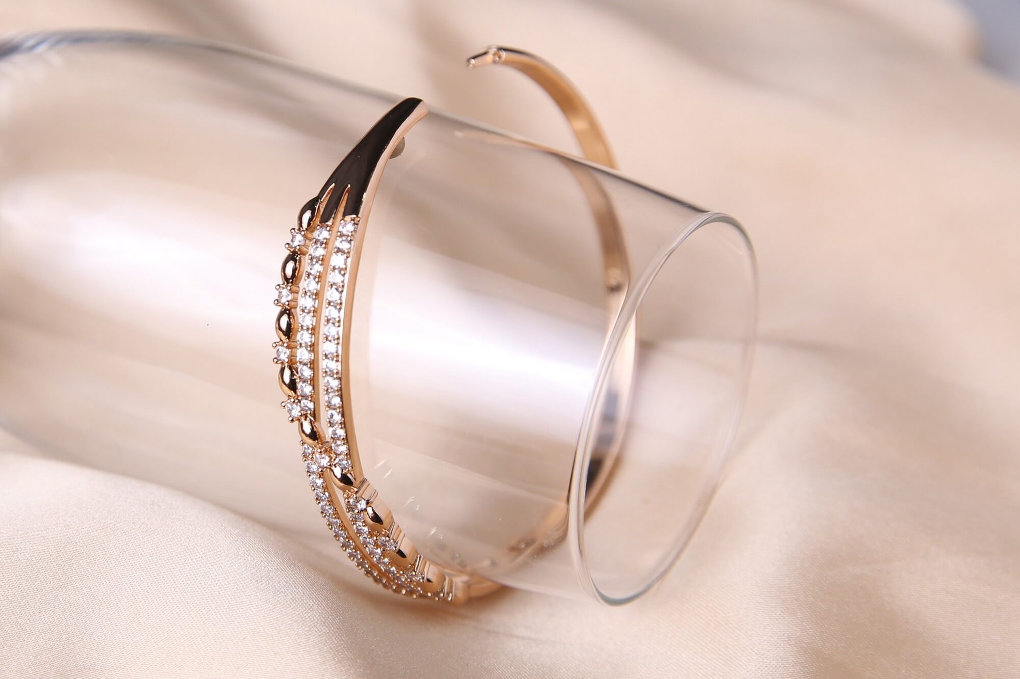 This elegant bangle bracelet features a sophisticated and dazzling design, perfect for adding glamour to any outfit. The bangle is crafted in a warm rose gold tone and is composed of three parallel rows that curve gracefully around the wrist. The two outer rows are fully paved with tiny, shimmering clear crystals. The central row features a unique alternating pattern of marquise-cut and round clear crystals. This triple-row design maximizes the brilliance, making this piece a stunning statement accessory