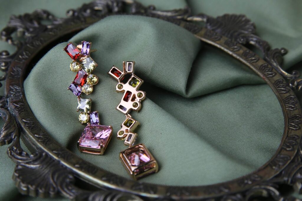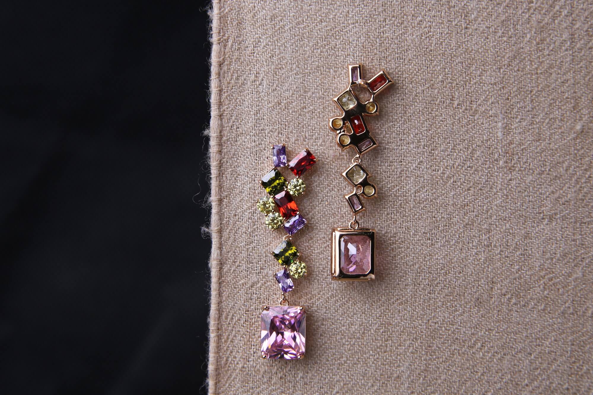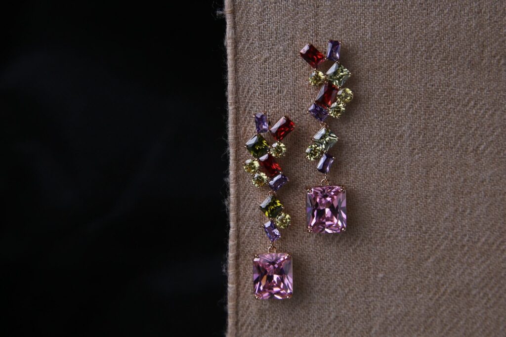 Make a bold statement with these dazzling multicolor gemstone earrings, featuring a dynamic mix of square-cut crystals in shades of pink, red, purple, and yellow. The asymmetrical cascading design adds a playful yet elegant touch, perfect for those who love vibrant, eye-catching accessories. Set in a gold-tone base, these earrings bring a modern and luxurious aesthetic, ideal for evening events, festive occasions, or adding a pop of color to your outfit.